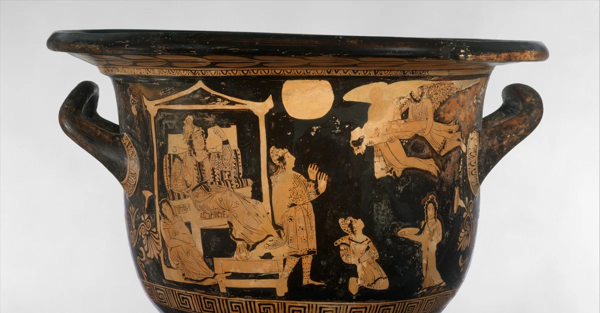 Terracotta bell-krater (mixing bowl) attributed to the Sarpedon Painter Obverse: Europa pleading with Zeus for the life of Sarpedon; Hera, Hypnos, Pasithea Reverse: Europa with attendants watching Hypnos and Thanatos bringing the body of Sarpedon c. 400–380 BCE