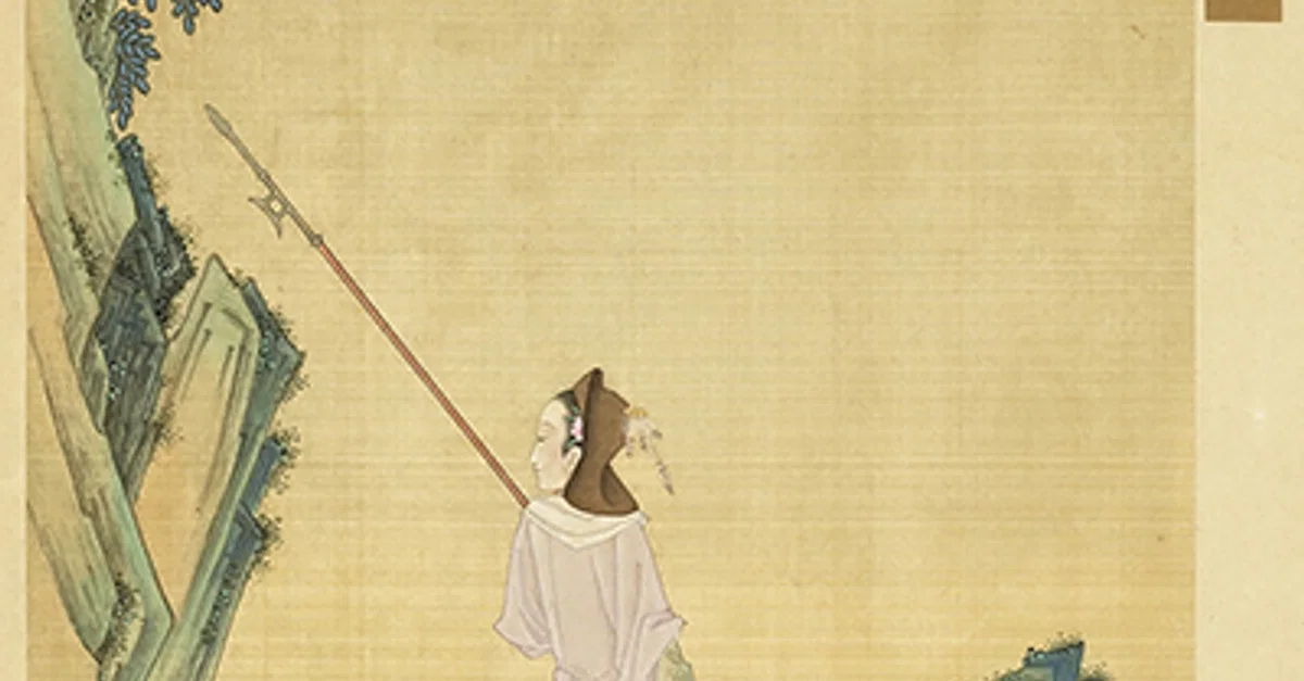 Painting depicting Mulan in the album known as Gathering Gems of Beauty, by artist He Dazi. Qing dynasty Album leaf, ink and colors on silk National Palace Museum, Taipei