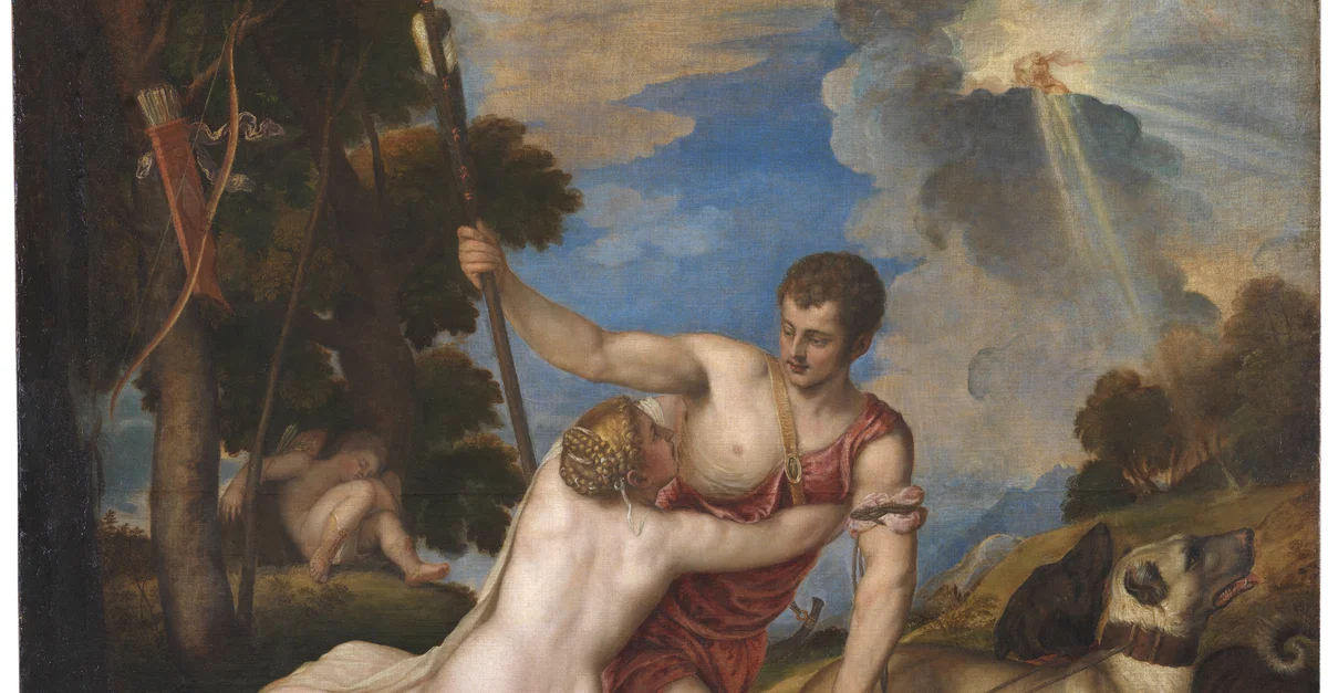 The Venus and Adonis painting by the Italian Renaissance artist Titian (c. 1487-1576 CE). c. 1554 CE. (Prado Museum, Madrid)
