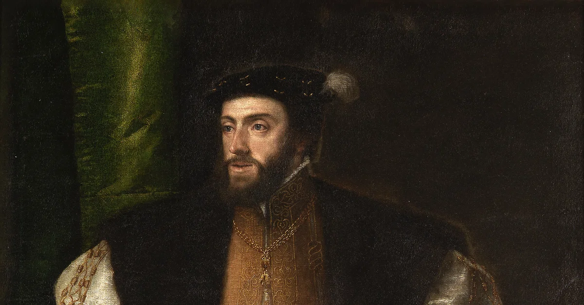 A portrait of Charles V, Holy Roman Emperor (r. 1519-1556) with his dog by the Italian Renaissance artist Titian (c. 1487-1576), completed in 1533.