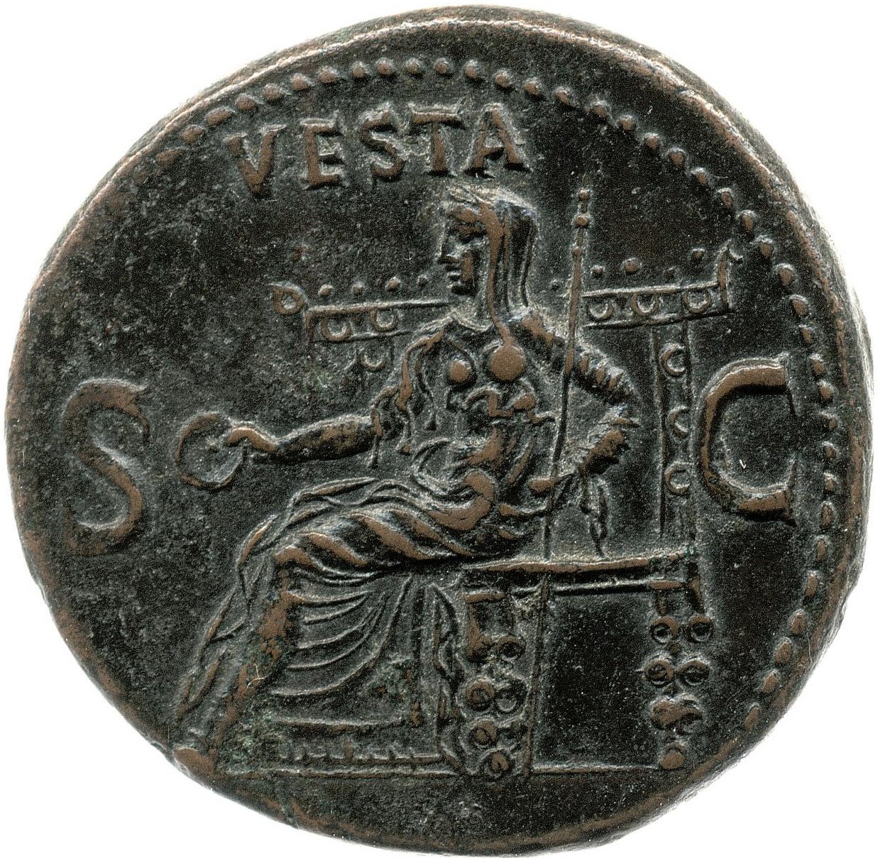 The reverse of a copper coin minted by Caligula (r. 37-41 CE) depicting the Roman goddess Vesta. Vesta is depicted seated on a throne, holding a libation bowl in one hand and a sceptre in the other. Made c. 37-38 CE. Rome. (British Museum)