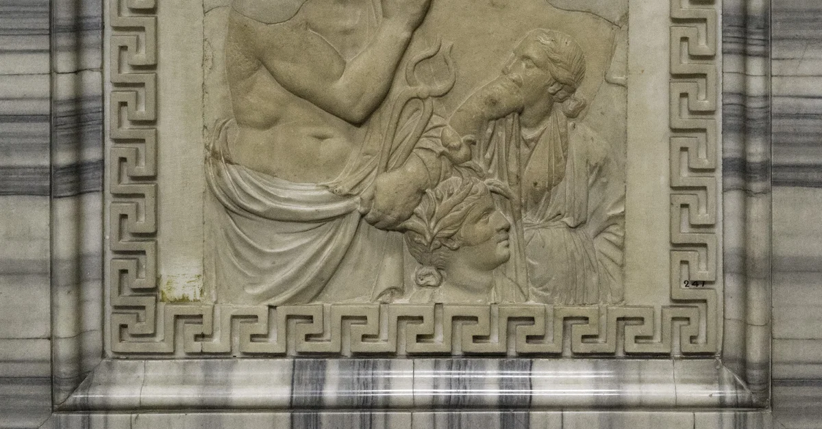 A Roman bas-relief depicting the Greek god Hephaestus (known as Vulcan to the Romans). The relief is part of a scene in which the goddess Gaia presents Athena with the infant Erichthonius, born from the seed of Hephaestus. Made c. 50 BCE-50 CE. Ostia, Italy. (Pio-Clementino Museum)