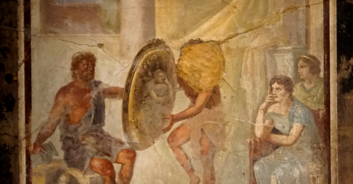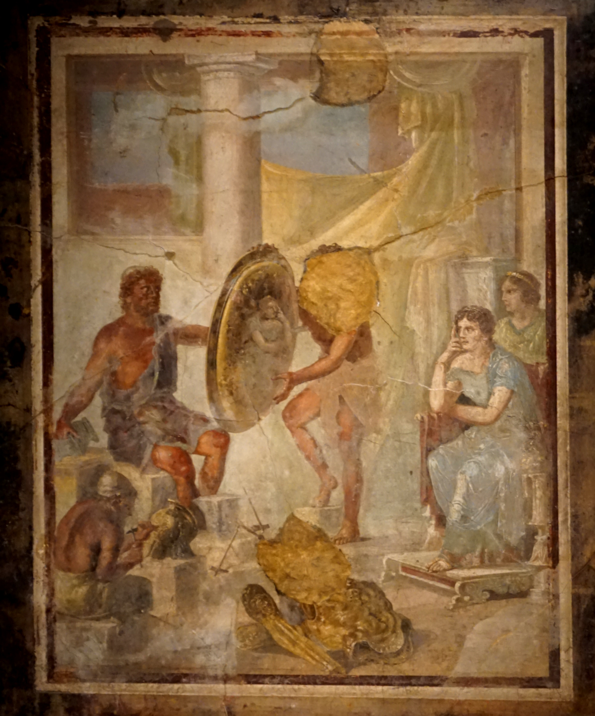 A Roman fresco depicting the forge-god Hephaestus presenting Thetis with the armour of her son Achilles, 1st century CE.