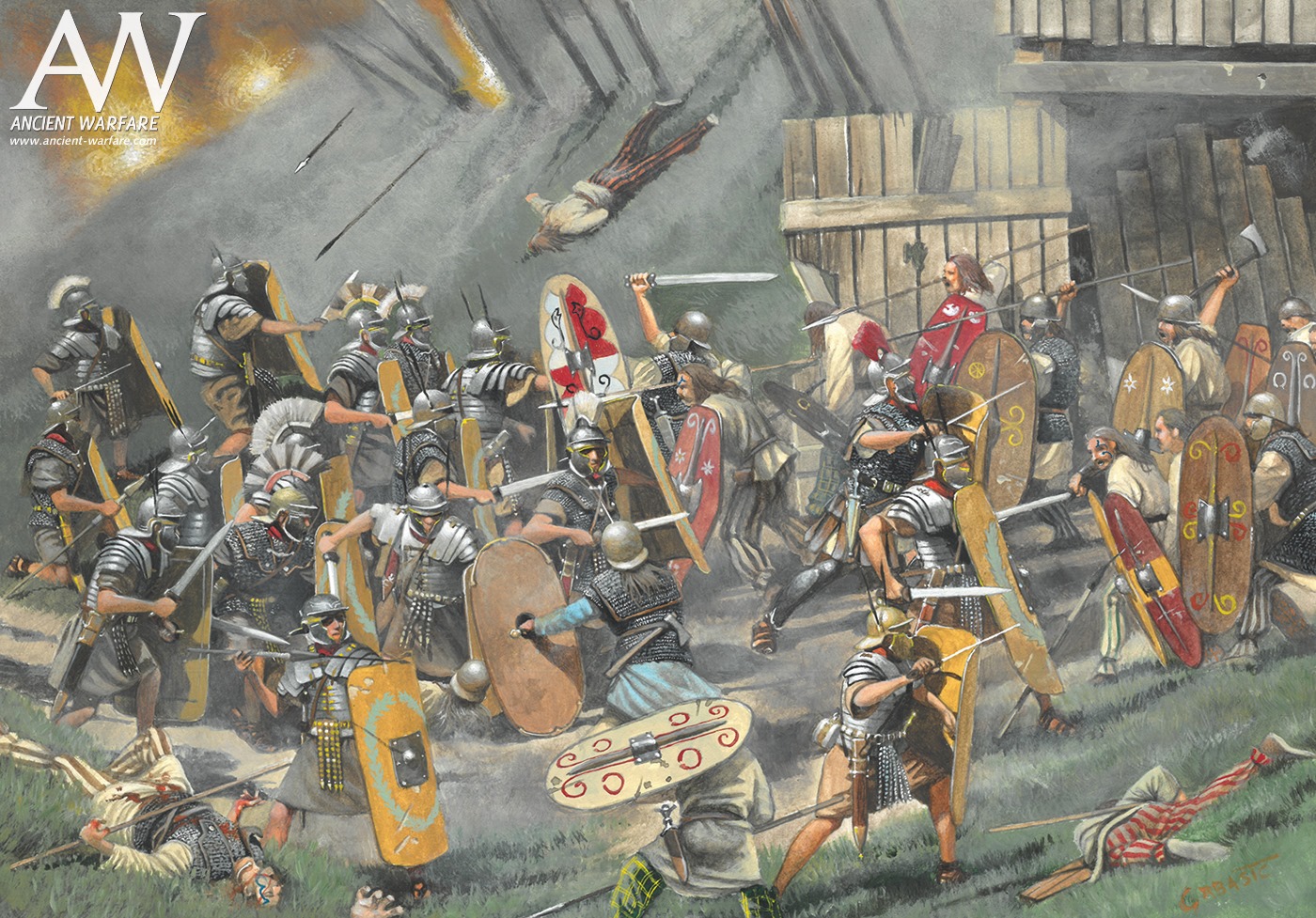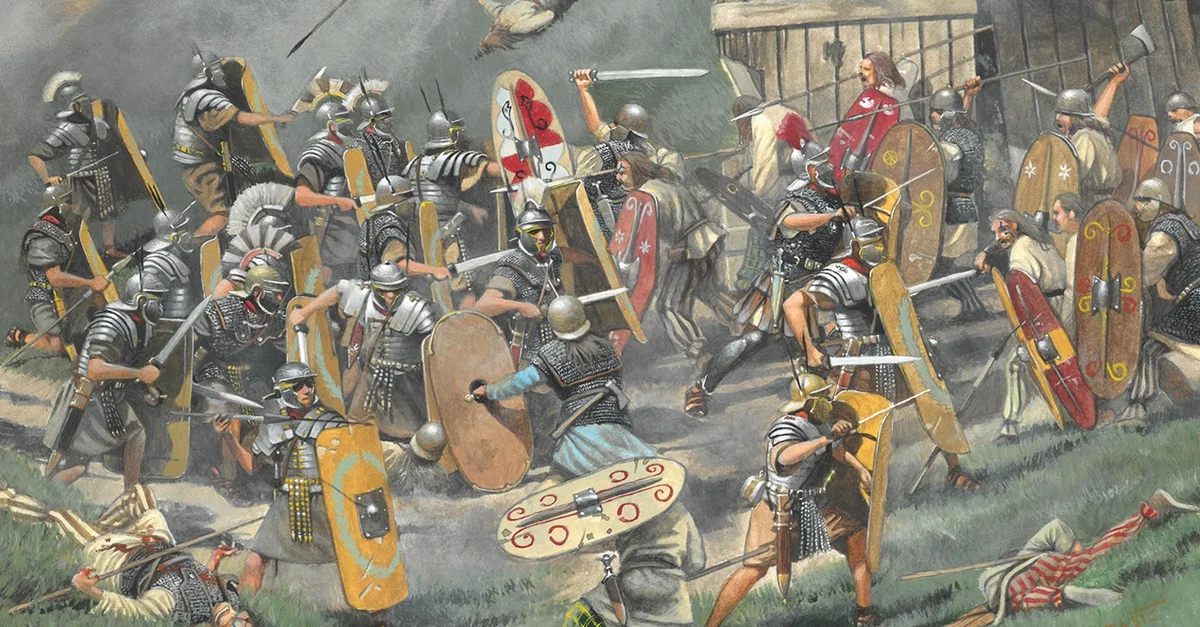 An illustration of Roman soldiers fighting British Celts at the fortifications at Cadbury Castle, Somerset. The scene is set sometime during the reign of Claudius (r. 41-54 CE), who began the Roman invasion of England. Illustration by Zvonimir Grbasic.