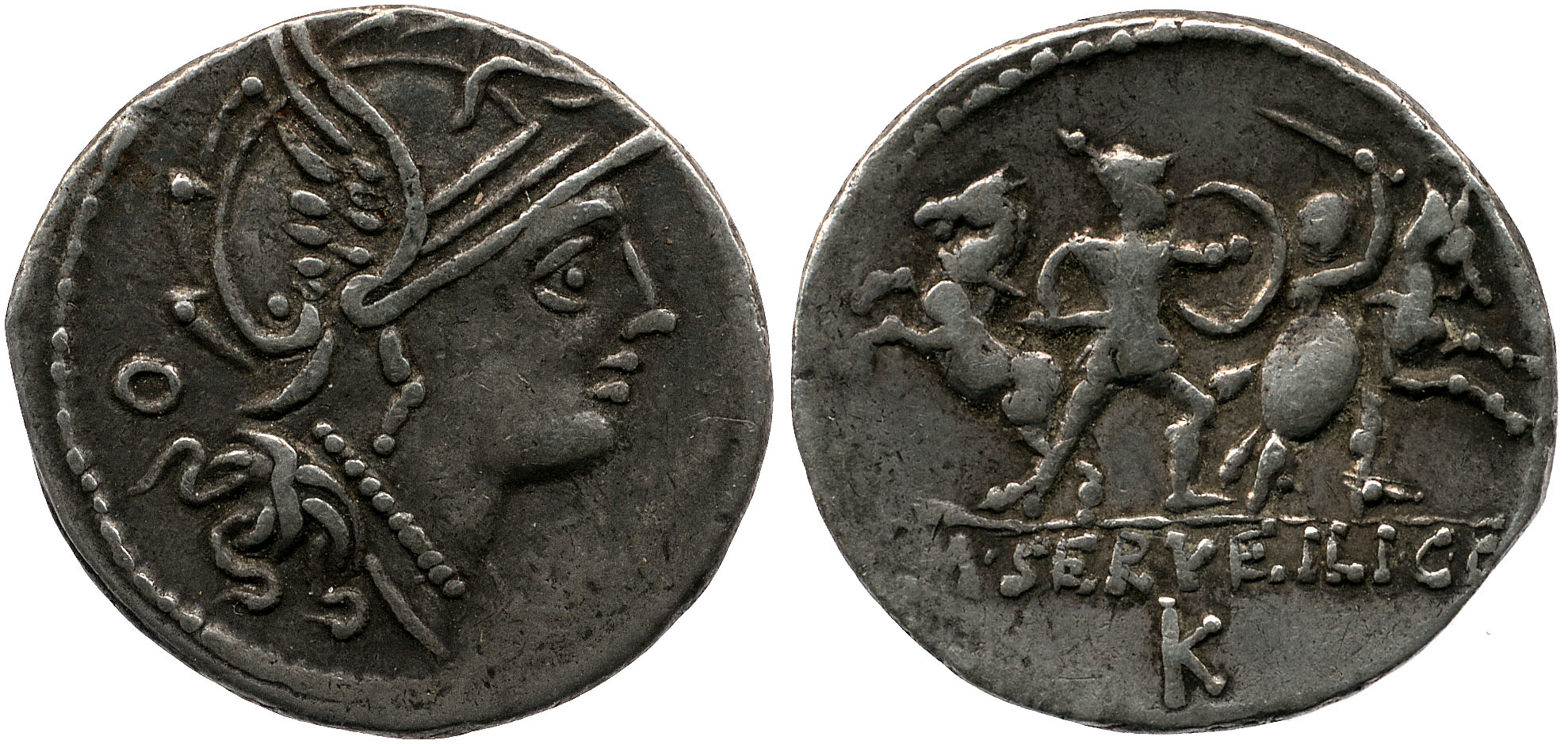 Silver denarius minted by M Servilius depicting the goddess Roma or Bellona on the obverse. On the reverse are two soldiers, with their horses in the background. c. 100 BCE. Rome. (British Museum)