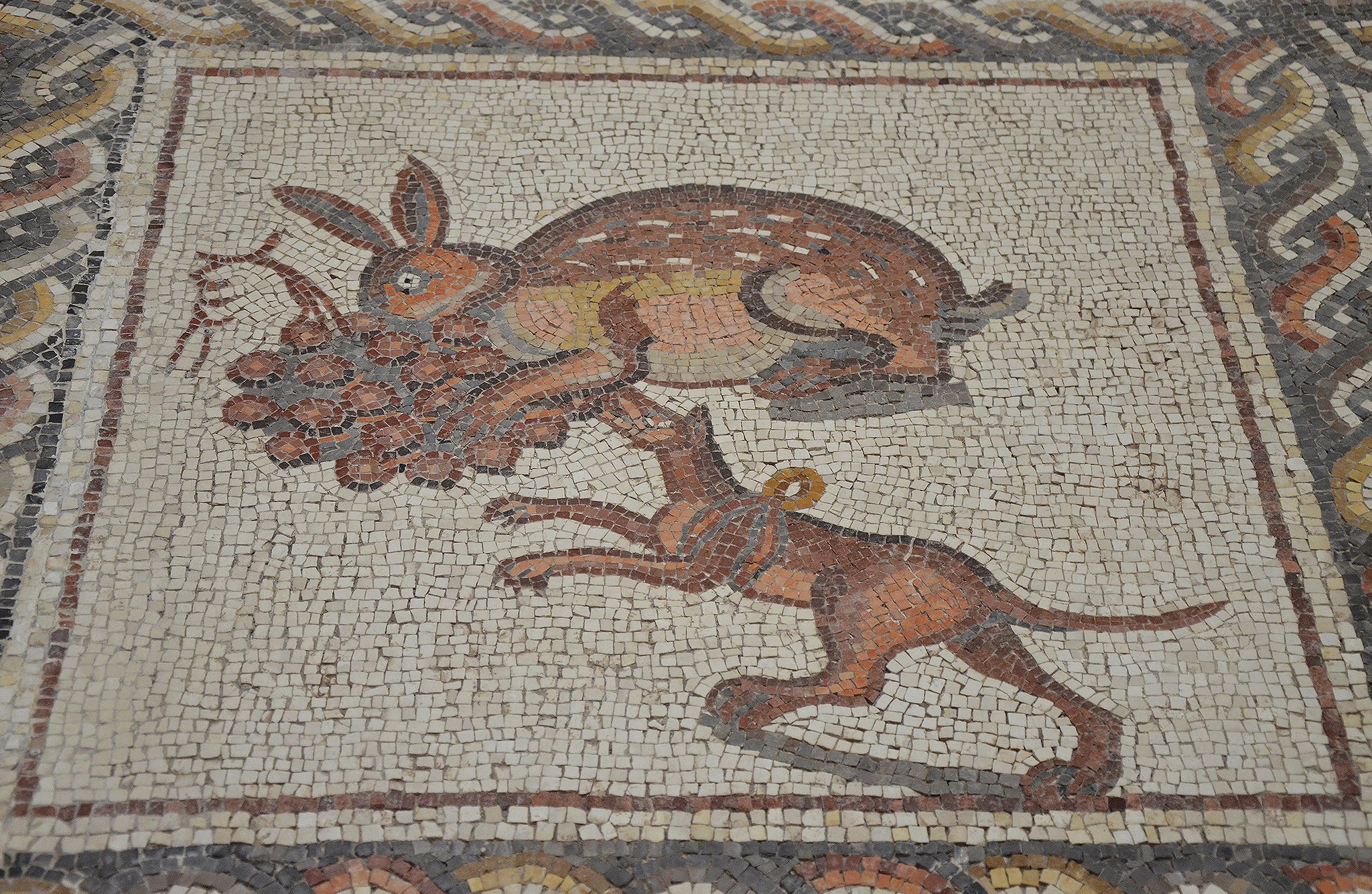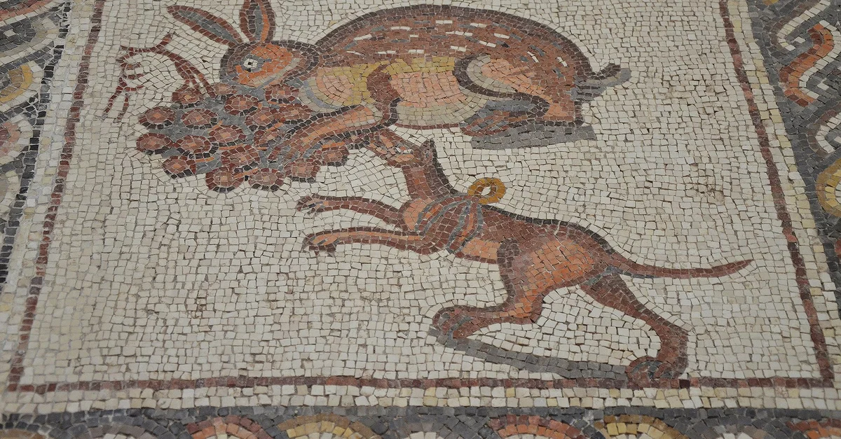 Detail of the Lod Mosaic: a rabbit eating grapes and a Lakonian hunting dog wearing a harness. The mosaic is believed to belong to a large and well-appointed Roman house in Lod, Israel, c. 300 CE.