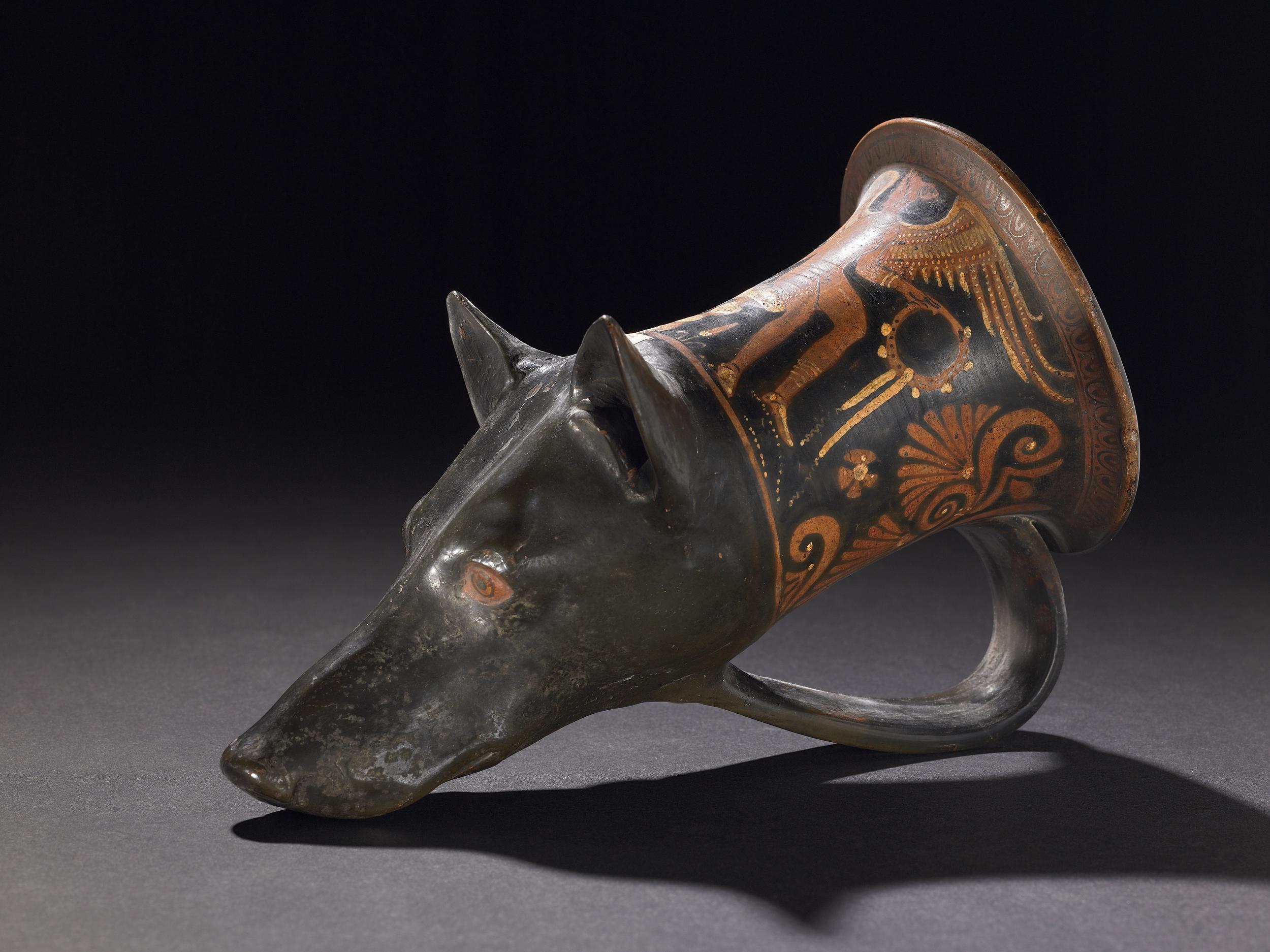 Red-figured pottery rhyton terminating in a dog's head depicting Eros seated on a rock to the right looking towards the left holding a bunch of grapes in his right hand and in his left a wreath from which hangs a taenia, in the field is flowers, plants and two rosettes; marked around the rim with egg moulding and on either side of the design with palmettes, the dog's head is painted black and the eyes are red with black markings; yellow accessories.