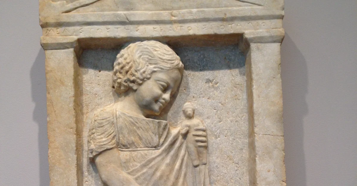 Stele showing a girl holding a doll in one hand and a bird in the other, which she seems to be offering with a gentle smile to the small dog jumping up to greet her, c. 340 BCE.