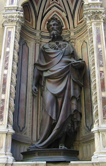 A statue of Saint John the Baptist by the Italian Renaissance artist Lorenzo Ghiberti (1378-1455 CE). The figure stands in the exterior wall of the Church of Orsanmichele in Florence. Completed c. 1415 CE.