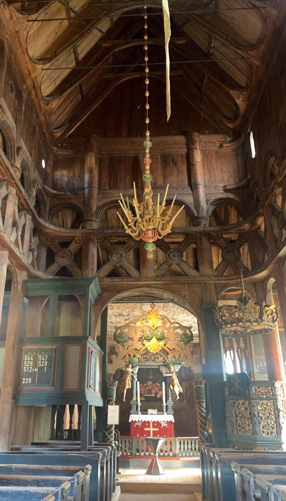 The interior of Lom Stave Church, Norway. The church has been standing since the last half of the 12th century CE but much of the decor dates from later periods.