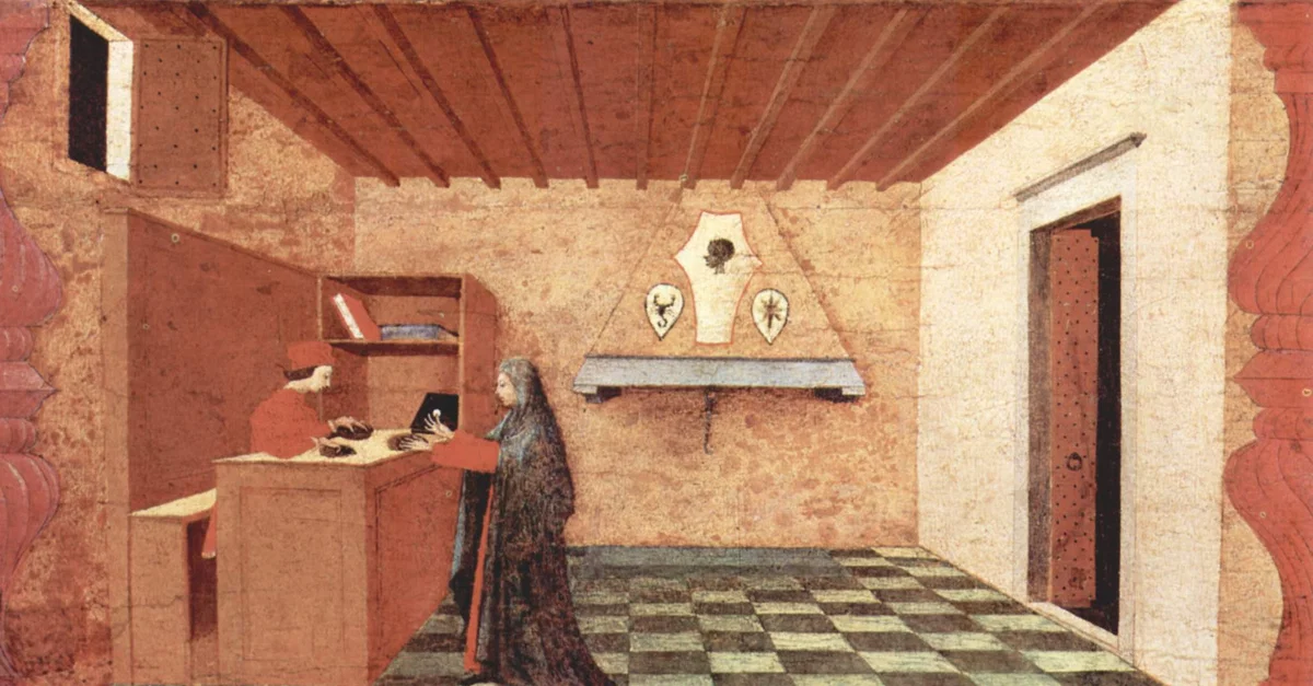 A painted panel, one of six which together make up the Miracle of the Desecrated Host by the Italian Renaissance artist Paolo Uccello (1397-1475 CE). This panel, the first in the series, is a triumph of Renaissance perspective painting. c. 1468 CE. (Galleria Nazionale delle Marche, Urbino, Italy)