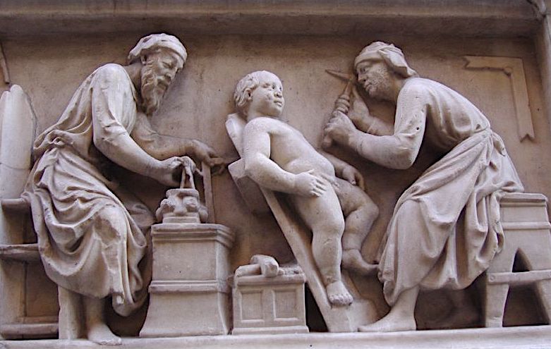 A detail of a relief showing a Renaissance sculptor's workshop by Nanni di Banco. c. 1416 CE. (Or San Michele, Florence)
