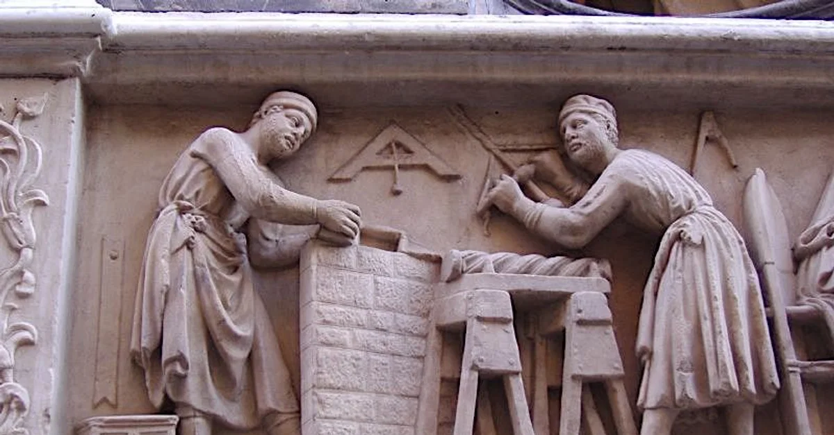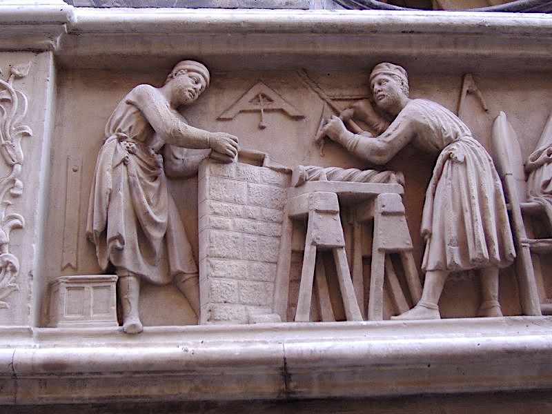 A detail of a relief showing the interior of a Renaissance sculptor's workshop by Nanni di Banco. c. 1416 CE. (Or San Michele, Florence)
