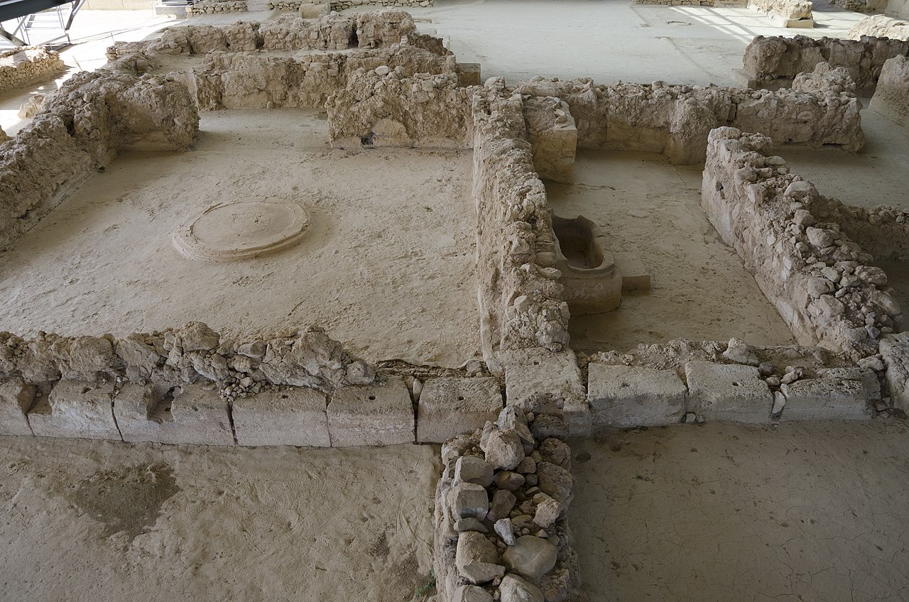 Ruins of the Palace of Nestor at Pylos showing the preserved and decorated hearth and bathtub. The palace dates to c. 1300-1200 BCE