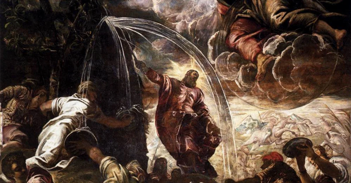 The oil painting Moses Drawing Water from the Rock by the Italian Renaissance artist Tintoretto (c. 1518-1594 CE). c. 1577 CE. (Scuola Grande di San Rocco, Venice)