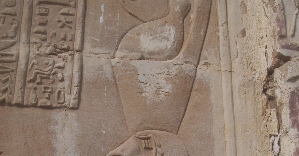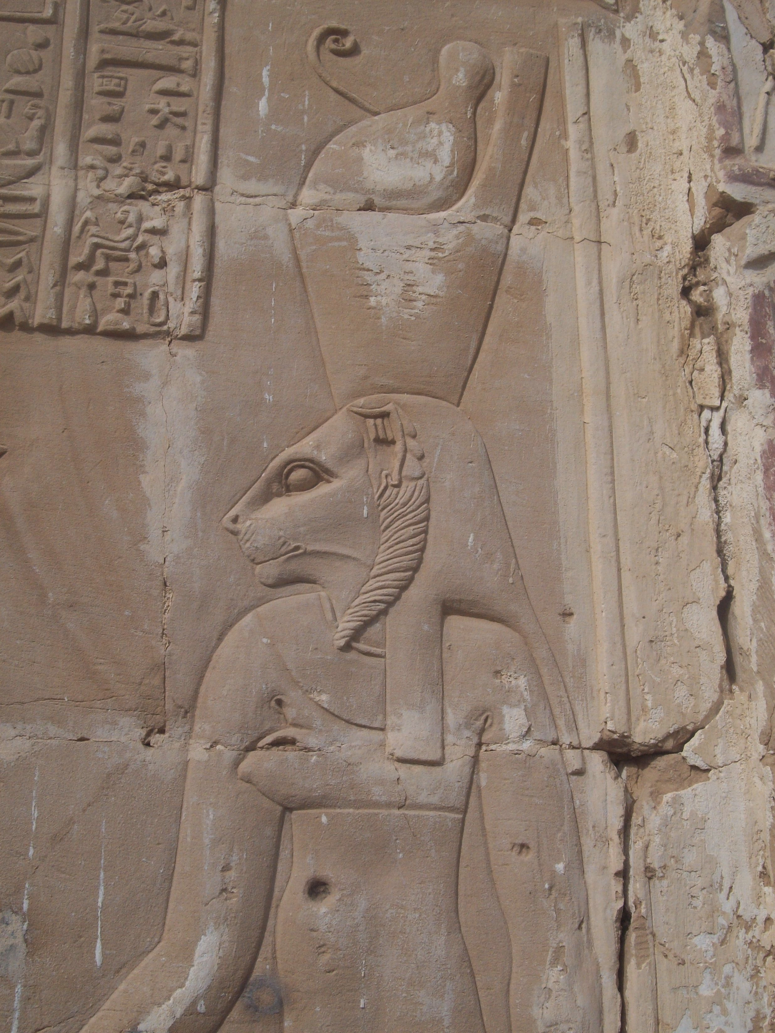 Detail of Mut on a larger relief depicting the goddess alongside Khonsu and Amun making offerings to the Roman Emperor. Temple of Deir el-Hagar, Dakhla Oasis. 1st Century CE, Roman era.