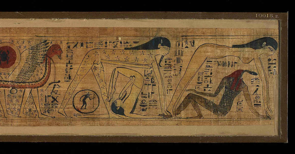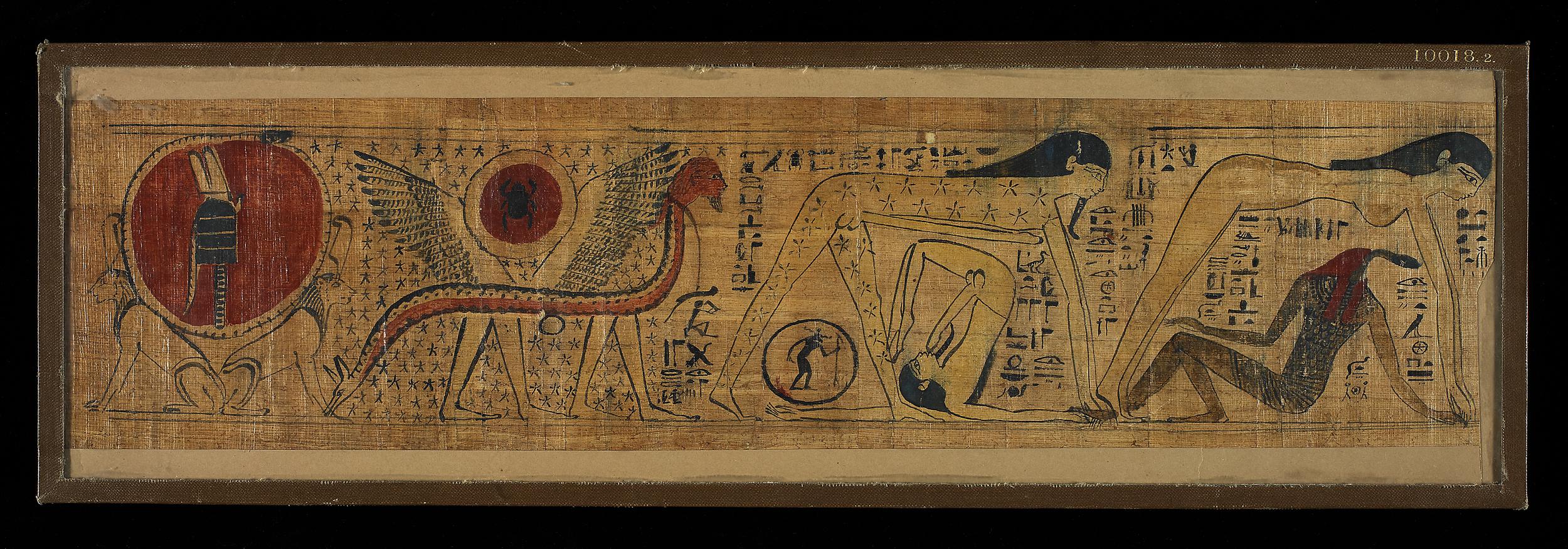 The Book of the Dead of Henuttawy. The winged serpent god Nehebkau is depicted on the left. In the center of the papyrus is Osiris, who lies beneath the personification of the night sky. On the right side of the scene, the goddess Nut arches over her consort, the earth god Geb (depicted here with the head of a snake). Third Intermediate Period of Egypt (c. 1069-525 BCE).