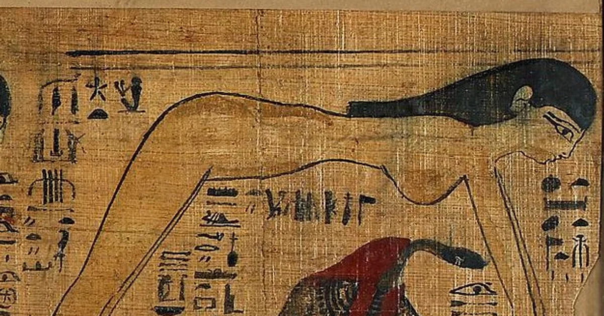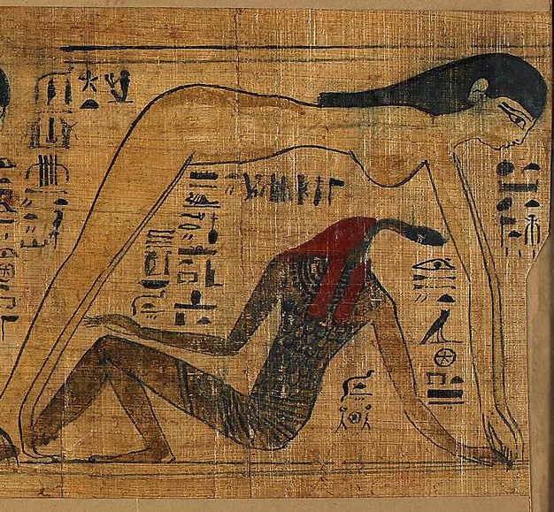 A detail of the Book of the Dead of Henuttawy, depicting the goddess Nut arched over the god Geb. Geb is depicted with the head of a snake. The full papyrus measures 74 cm x 23 cm (29 in x 9 in). Egypt. Third Intermediate Period (c. 1069-525 BCE). (Courtesy of the British Museum)