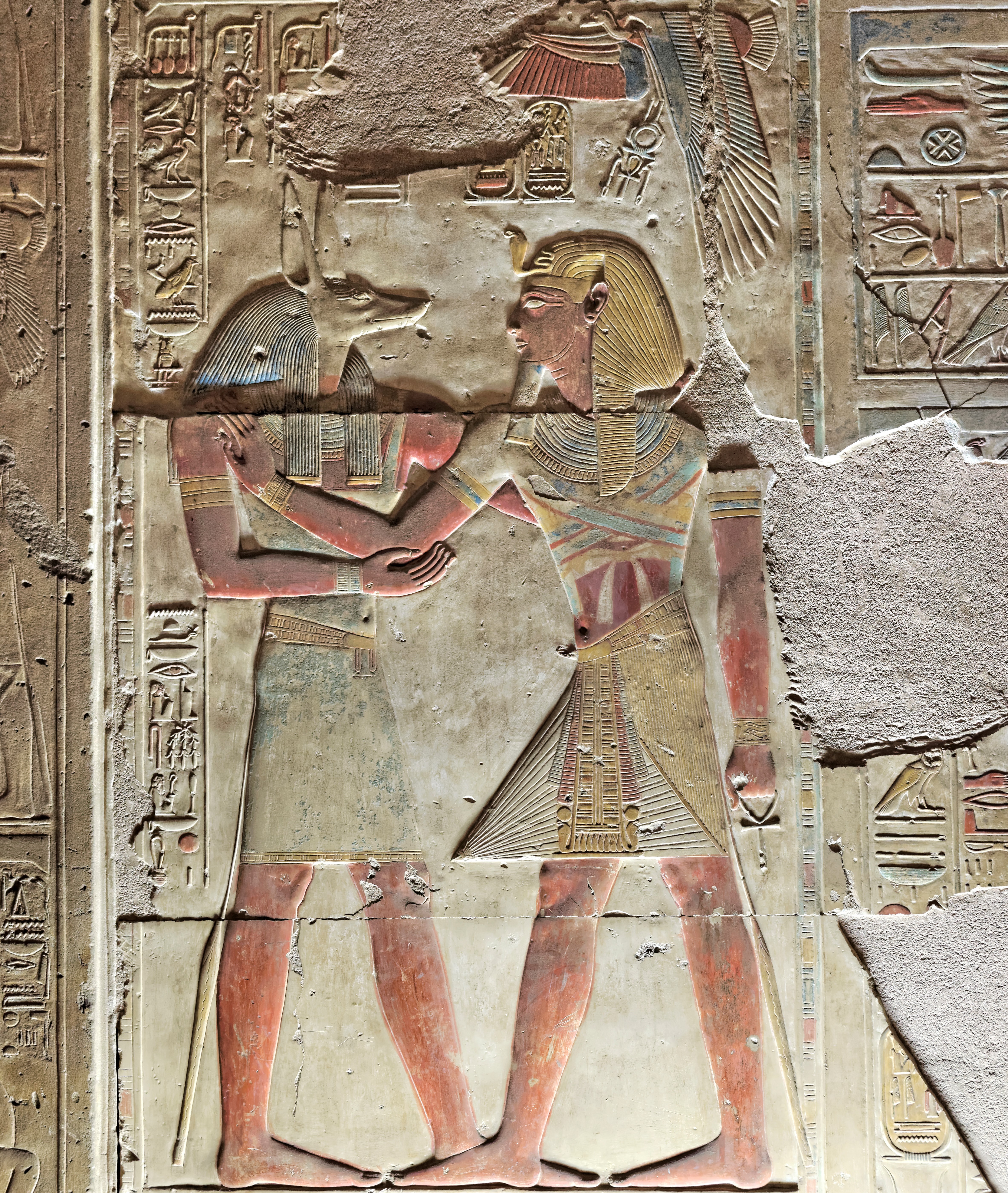 Relief of Wepwawet embracing Seti I (1290-1279 BCE). Located between the entrances of the Chapels of Ptah and Ra-Horakhty within the Temple of Seti. Abydos, Egypt.