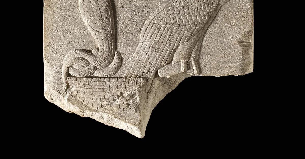 A limestone relief depicting a vulture (possibly the goddess Nekhbet) and a rearing cobra (representing Wadjet) perched on a basket. Nekhbet and Wadjet were known as the "Two Ladies", representing Upper Egypt and Lower Egypt respectively. Together, they were a symbol for the unification of Egypt. The relief dates to the early Ptolemaic period c. 305-250 BCE. Egypt. (Walters Art Museum).