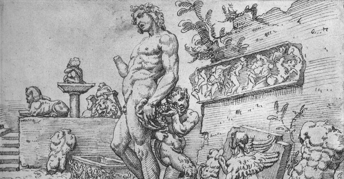 The pen and ink on paper drawing of Jacopo Galli's Garden in Rome by Martin van Heemskerck. Galli was a famous collector of antiquities during the Renaissance. c. 1532-5 CE. (Staatliche Museen, Berlin)