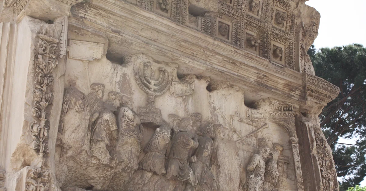 A panel from the Triumphal Arch of Titus, erected in c. 81 CE by Domitian to commemorate his brother Titus' campaigns in the Jewish War (70-71 CE). The relief shows the victory procession carrying booty from the Second Temple of Jerusalem. Forum Romanum, Rome.