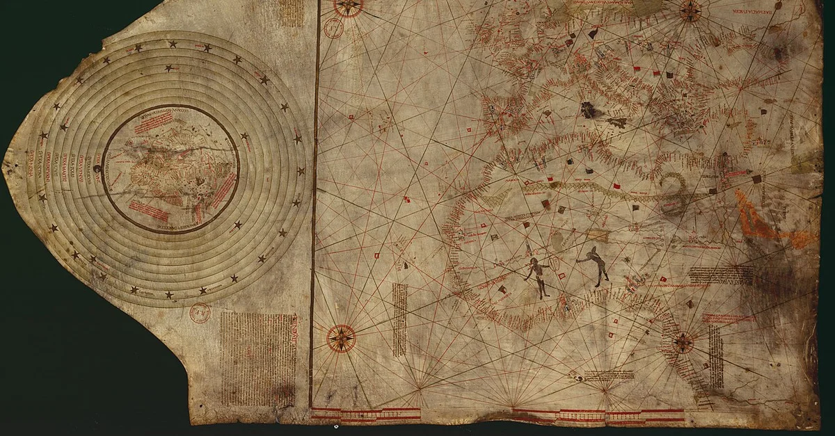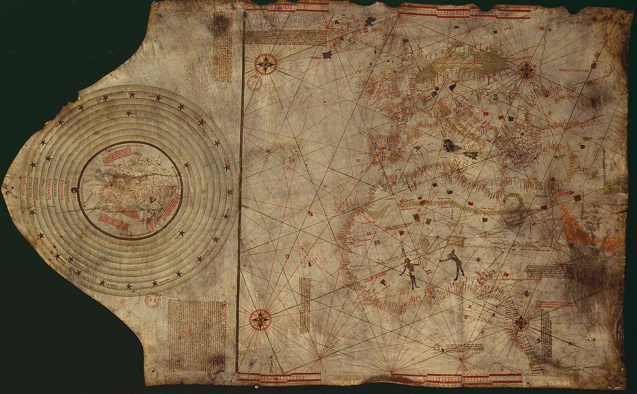 Nautical chart of the North-East Atlantic Ocean, the Baltic Sea, the Mediterranean Sea and the Black Sea, accompanied by a circular world map. Alleged author: Cristopher Columbus (l. 1451-1506 CE) Gallica Digital Library