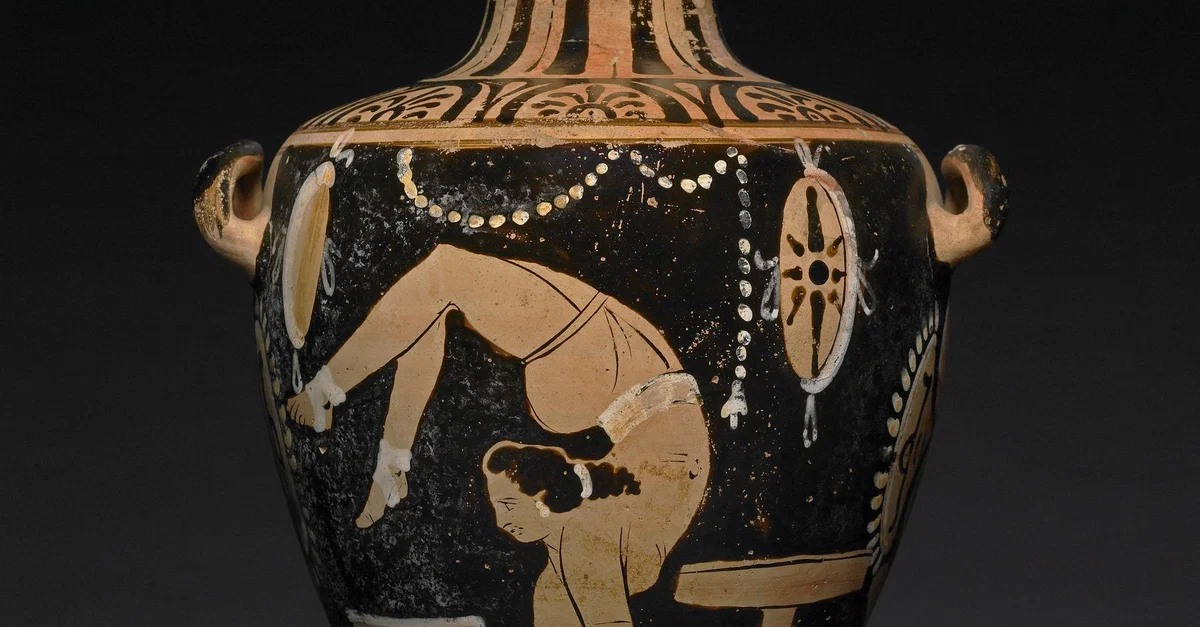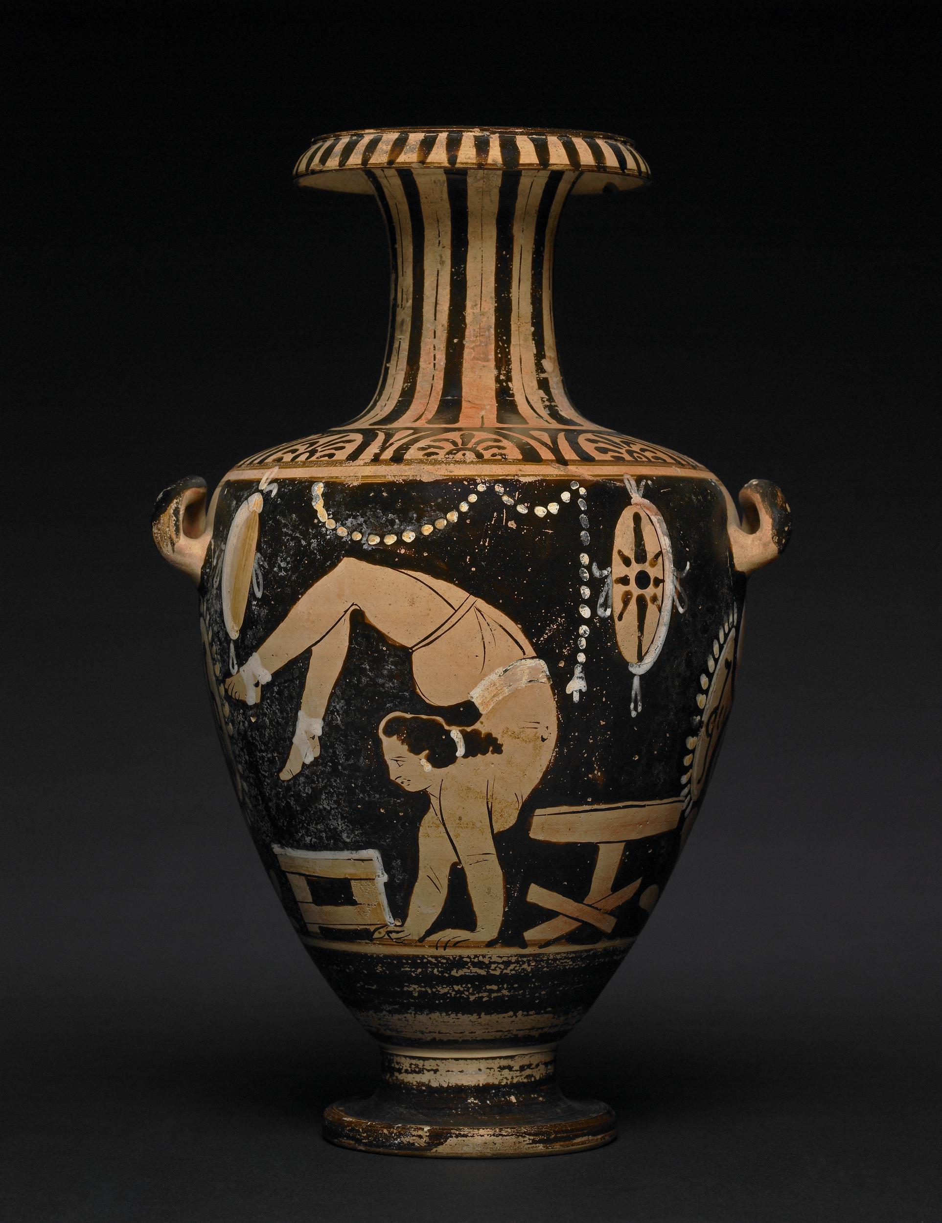 A red-figure hydria (water-jar) made and found in Campania, Italy, from c. 325-350 BCE, attributed to The Foundling Painter. A dancing girl (orchestris) stands on her hands in an acrobatic act, which can be a somersault or a walk on hands. She is between a stool and a potter’s turntable, both of which could be used for performing amazing acrobatic acts. The hand-drums (tympana) and the decorative band of beads suggest that her performance takes place in a party. In ancient Greece, troupes of entertainers could be hired to entertain the guests at a symposium (drinking-party).