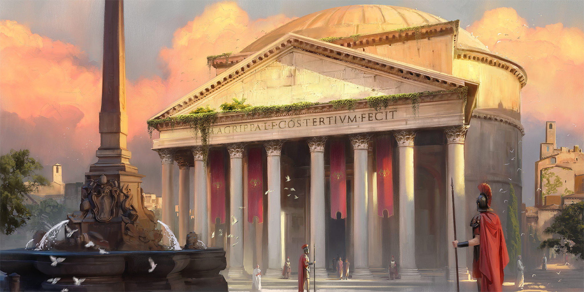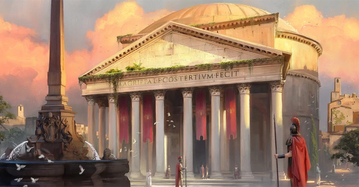 An artist's representation of the Pantheon in Rome as it may have appeared when it was completed c. 125 CE. From the game Old World.