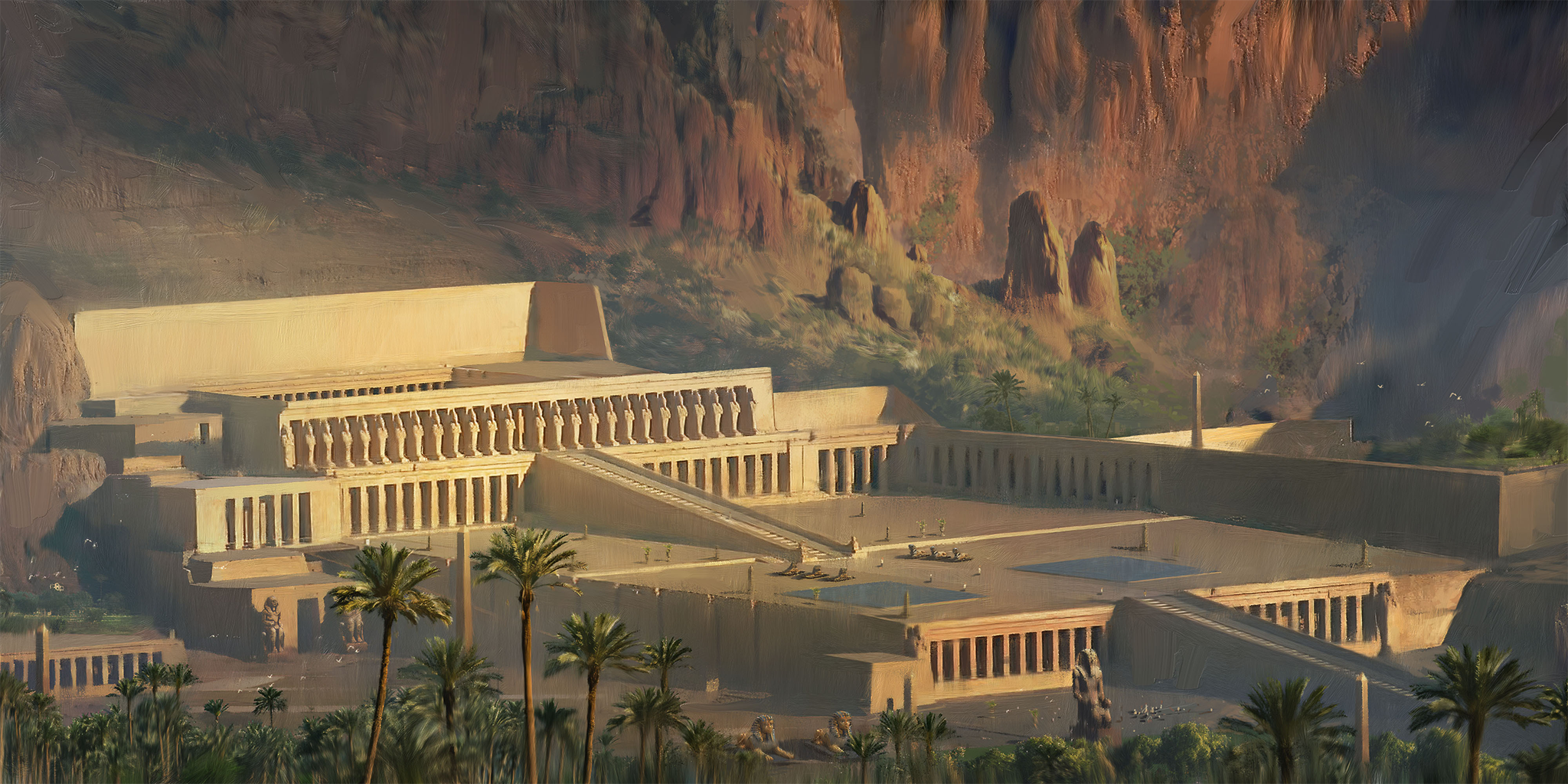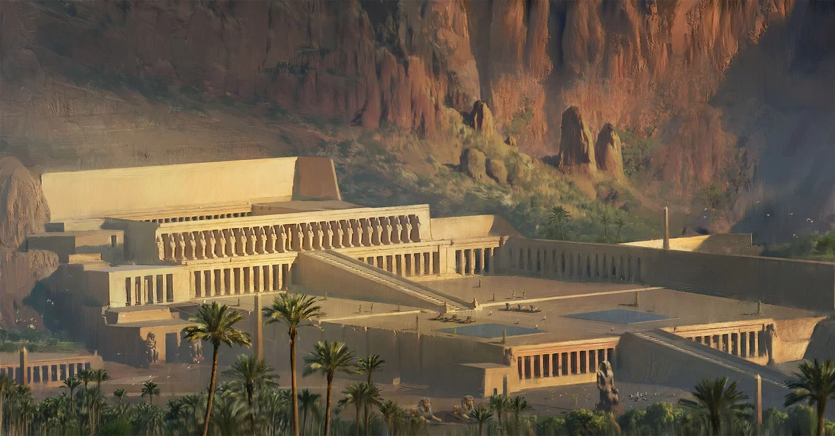 An artist's depiction of the Valley of the Kings, part of the Theban Necropolis, as it may have appeared during the New Kingdom of Egypt (c. 1570- c.1069 BCE). From the game Old World.