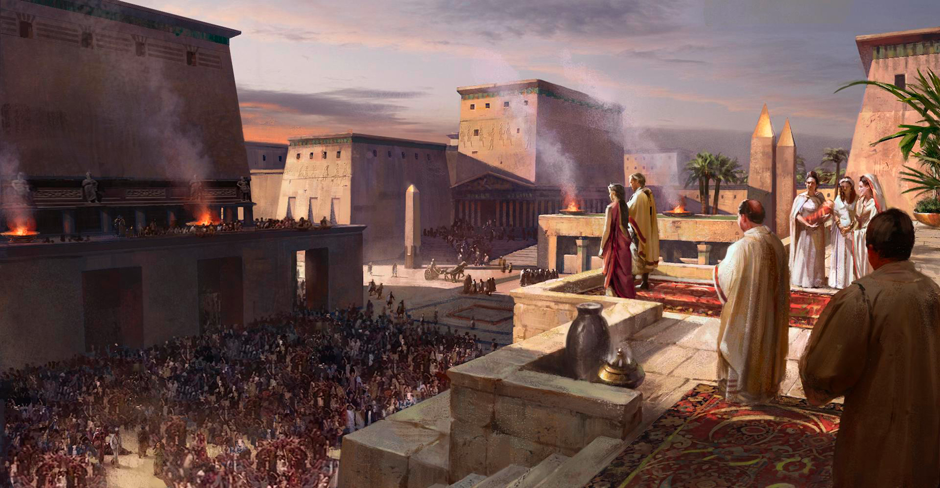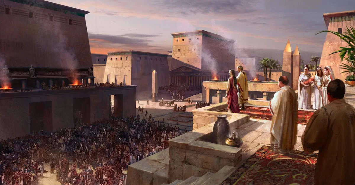 An artistic depiction of the infant Caesarion (47-30 BCE) being presented to the Alexandrians by his parents Cleopatra VII (69-30 BCE) and Julius Caesar (100-44 BCE). From the game Old World.