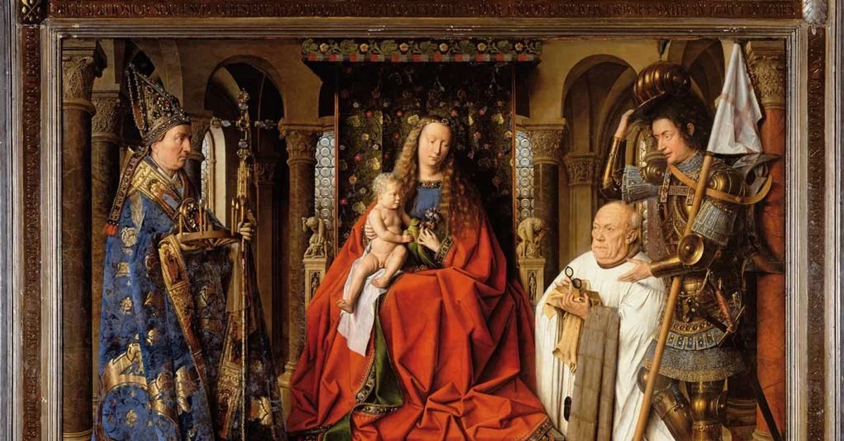 The Madonna with Canon van der Paele painting by the Netherlandish Renaissance artist Jan van Eyck (c. 1390-1441 CE). 1436 CE. (Groeningemuseum, Bruges, Belgium)