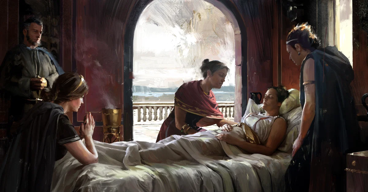 An artist's depiction of an ailing queen in the ancient Mediterranean, likely Greece or Macedon. From the game Old World.