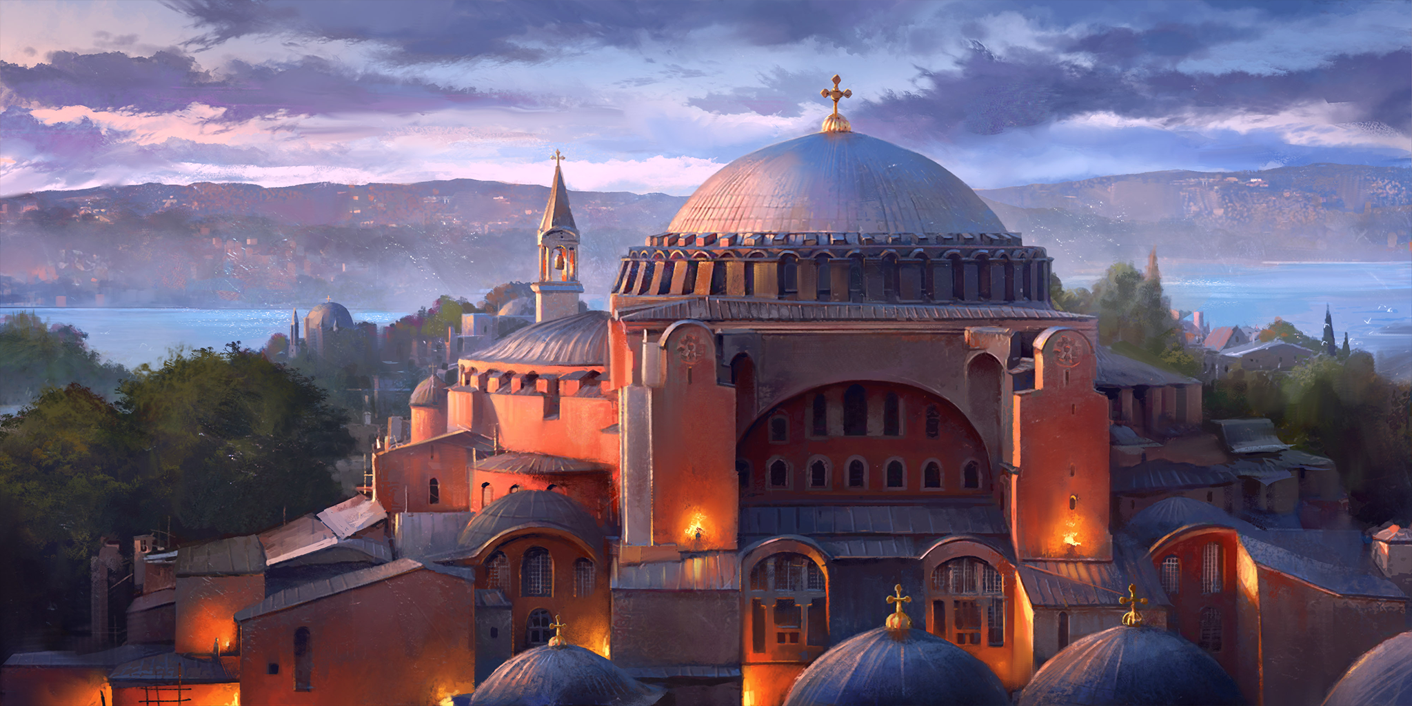 An artist's depiction of the Hagia Sophia in Constantinople, as it may have appeared in 537 CE. From the game Old World.