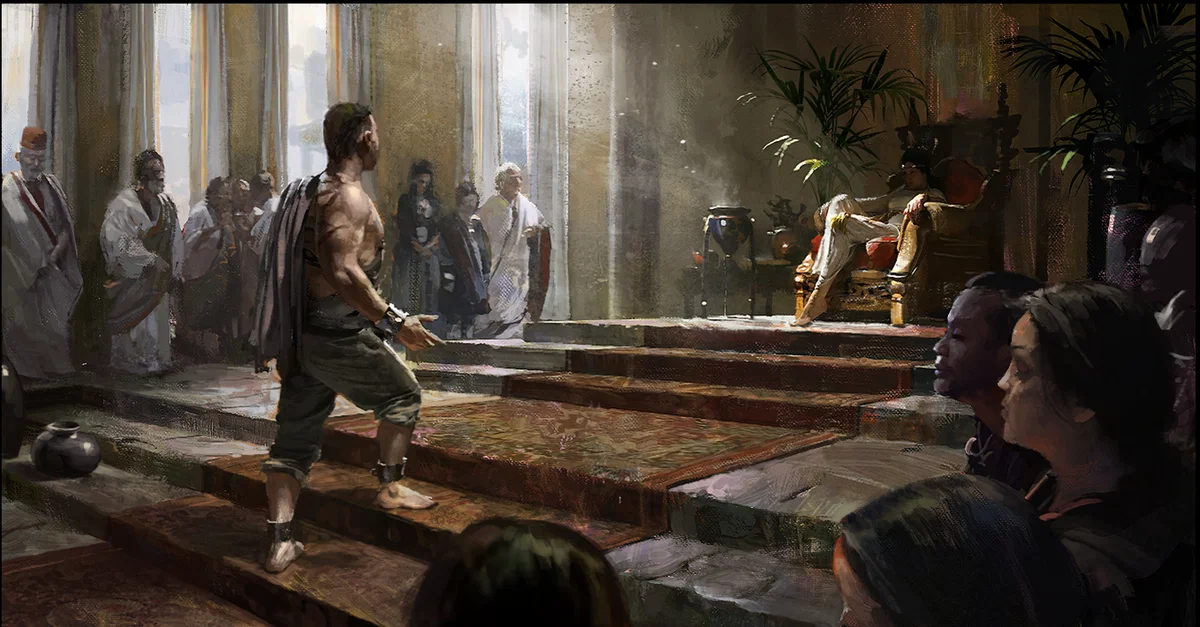 An artist's depiction of an escaped slave standing in the court of a Hellenistic queen. From the game Old World.