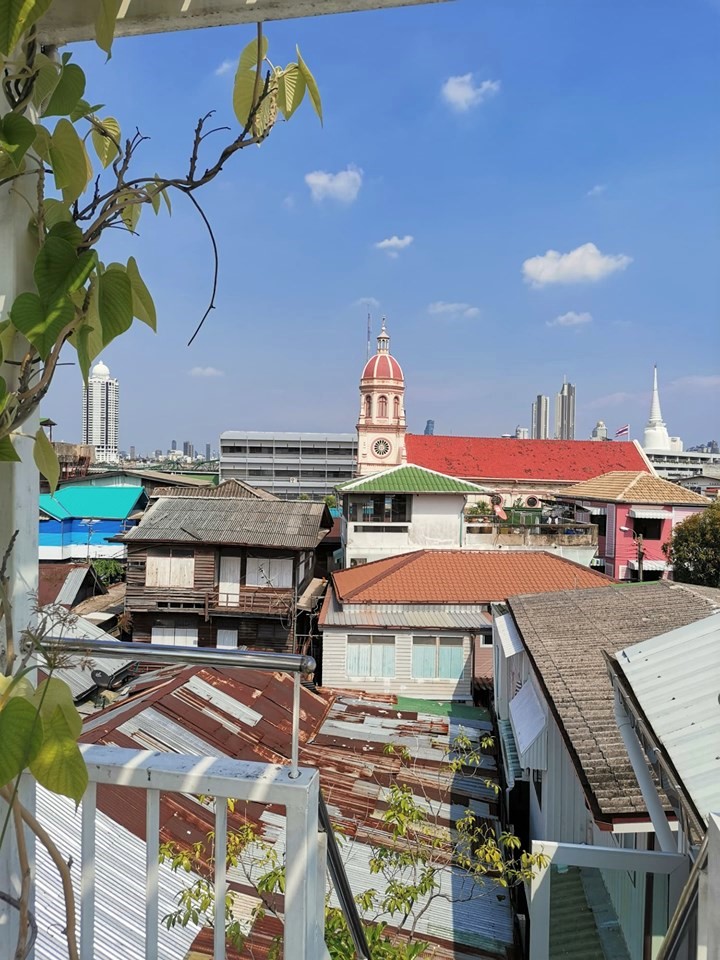 Panoramic view of the Kudeejeen area of Bangkok, Thailand showing the Renaissance Neoclassical style Santa Cruz church rising above the rooftops. The church was reconstructed in 1843 CE.