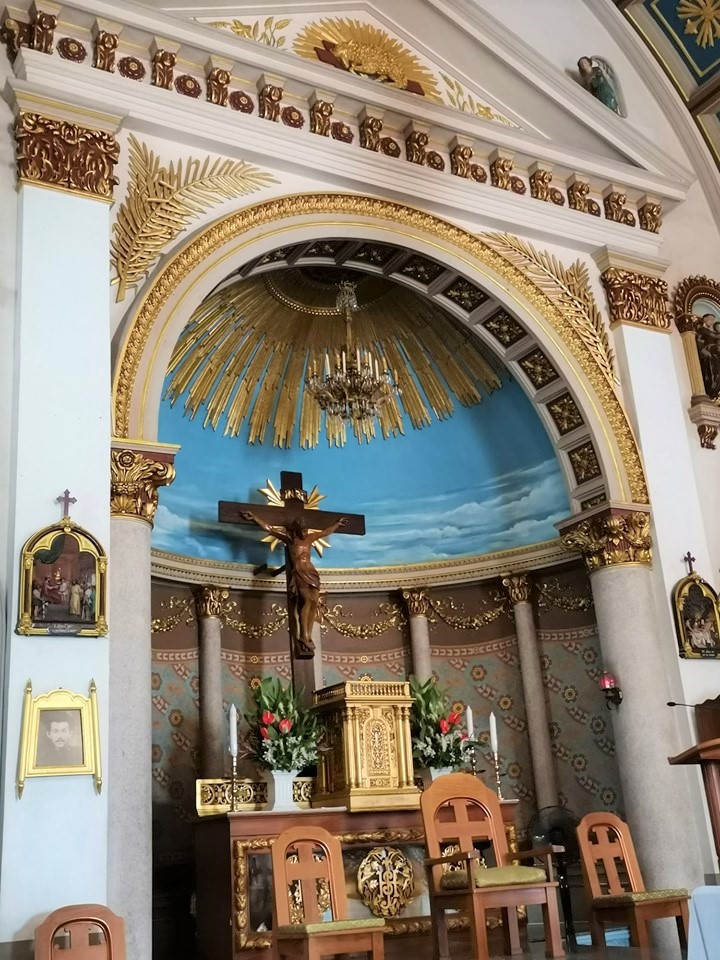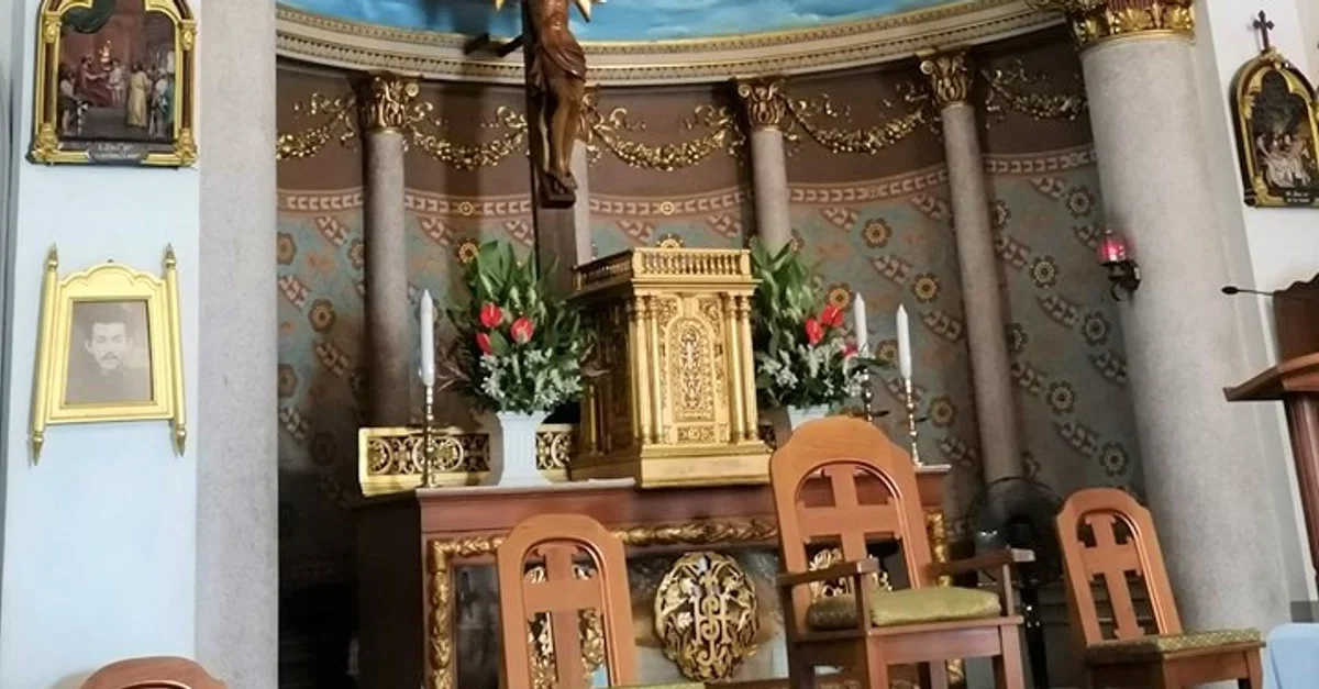 The Santa Cruz church altar showing a sky-coloured fresco of Jesus on the cross. The Renaissance Neoclassical style church standing today in Kudeejeen, Bangkok was built in 1834 CE.