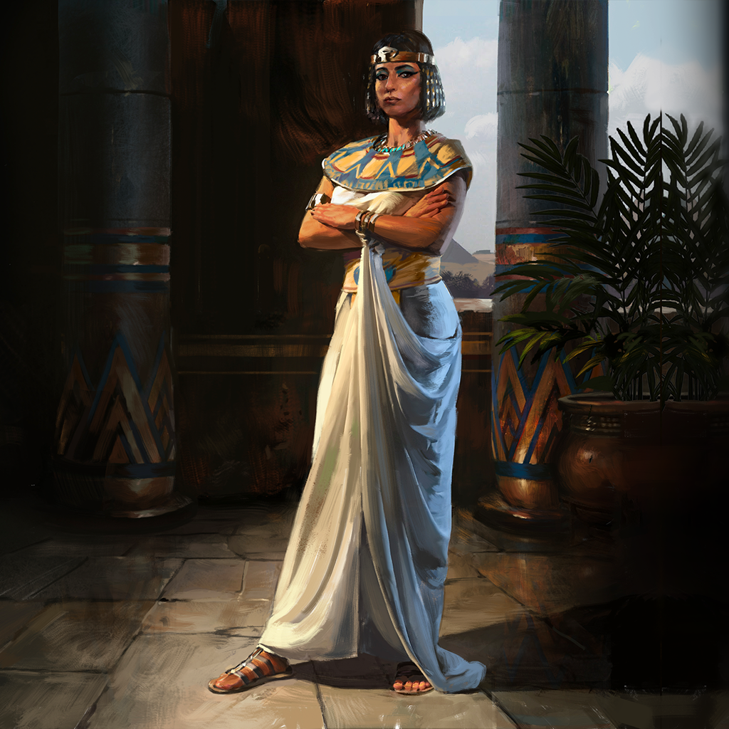 Egyptian Pharaoh Hatshepsut (1479-1458 BCE) depicted in the game Old World.