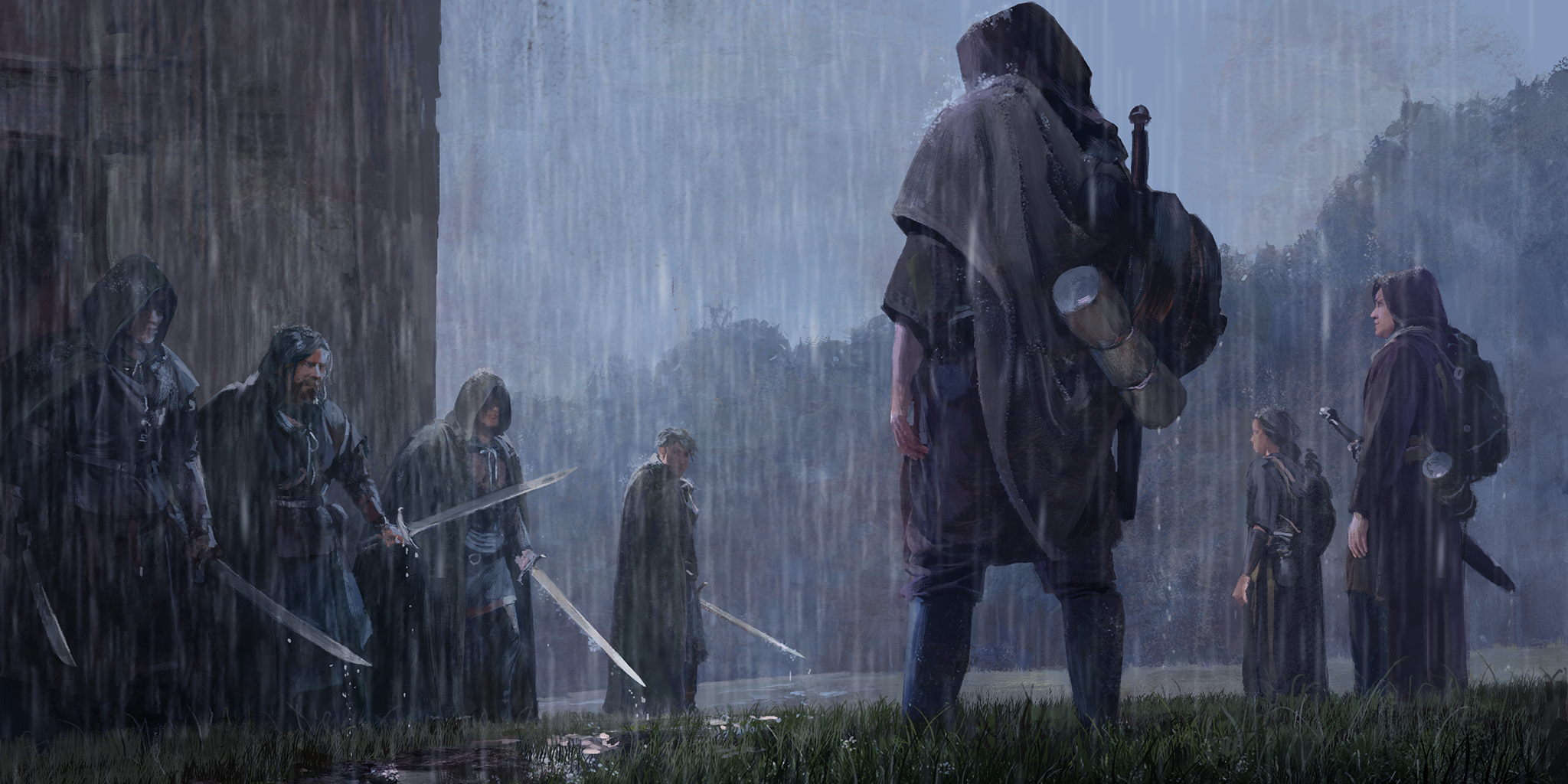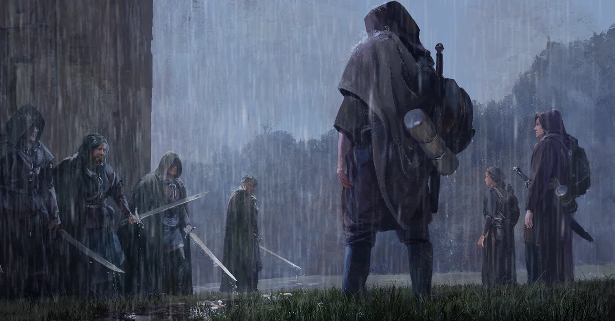 Medieval soldiers prepare to battle one another in the rain and mud. From the game Old World.