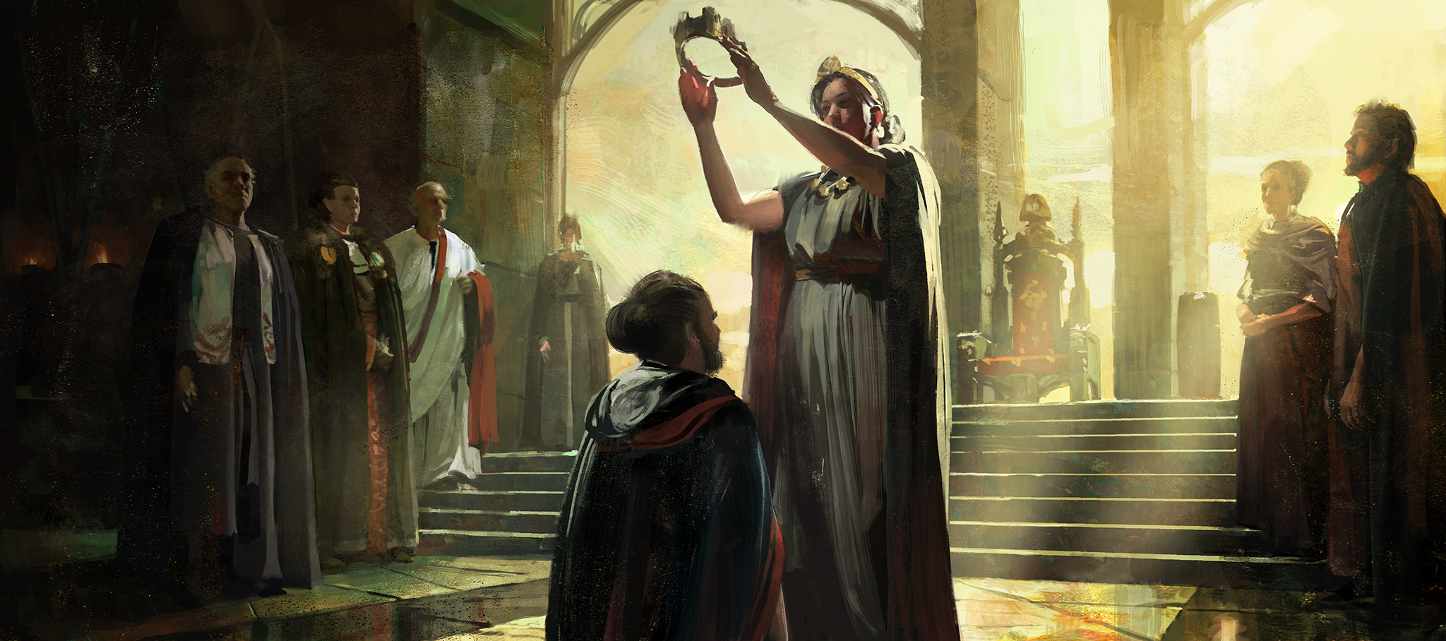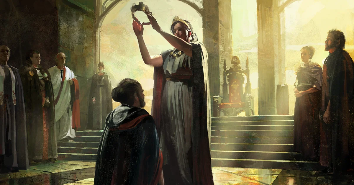 An artist's depiction of an coronation ceremony in early Medieval Europe. From the game Old World.
