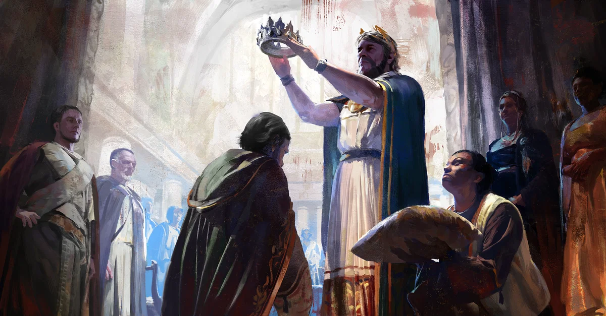 Artist's depiction of a Medieval king being coronated. From the game Old World.