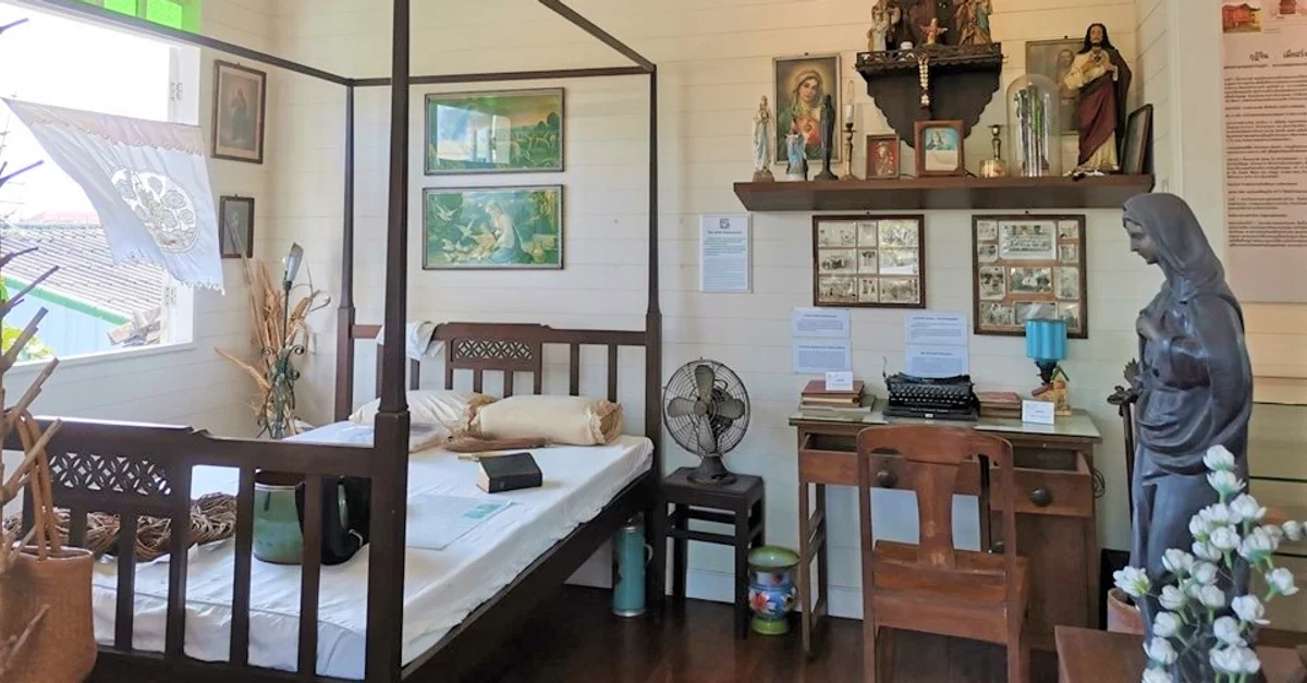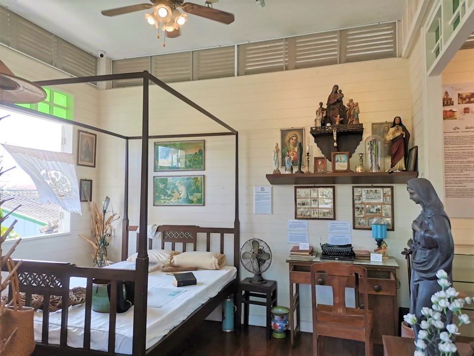 Museum display at the Baan Kudichin Museum in Bangkok, Thailand showing furniture, bed and religious icons from former homes in the Kudeejeen community (a Portuguese community).