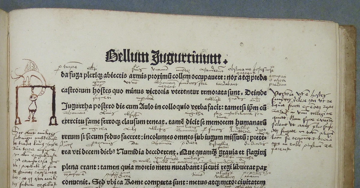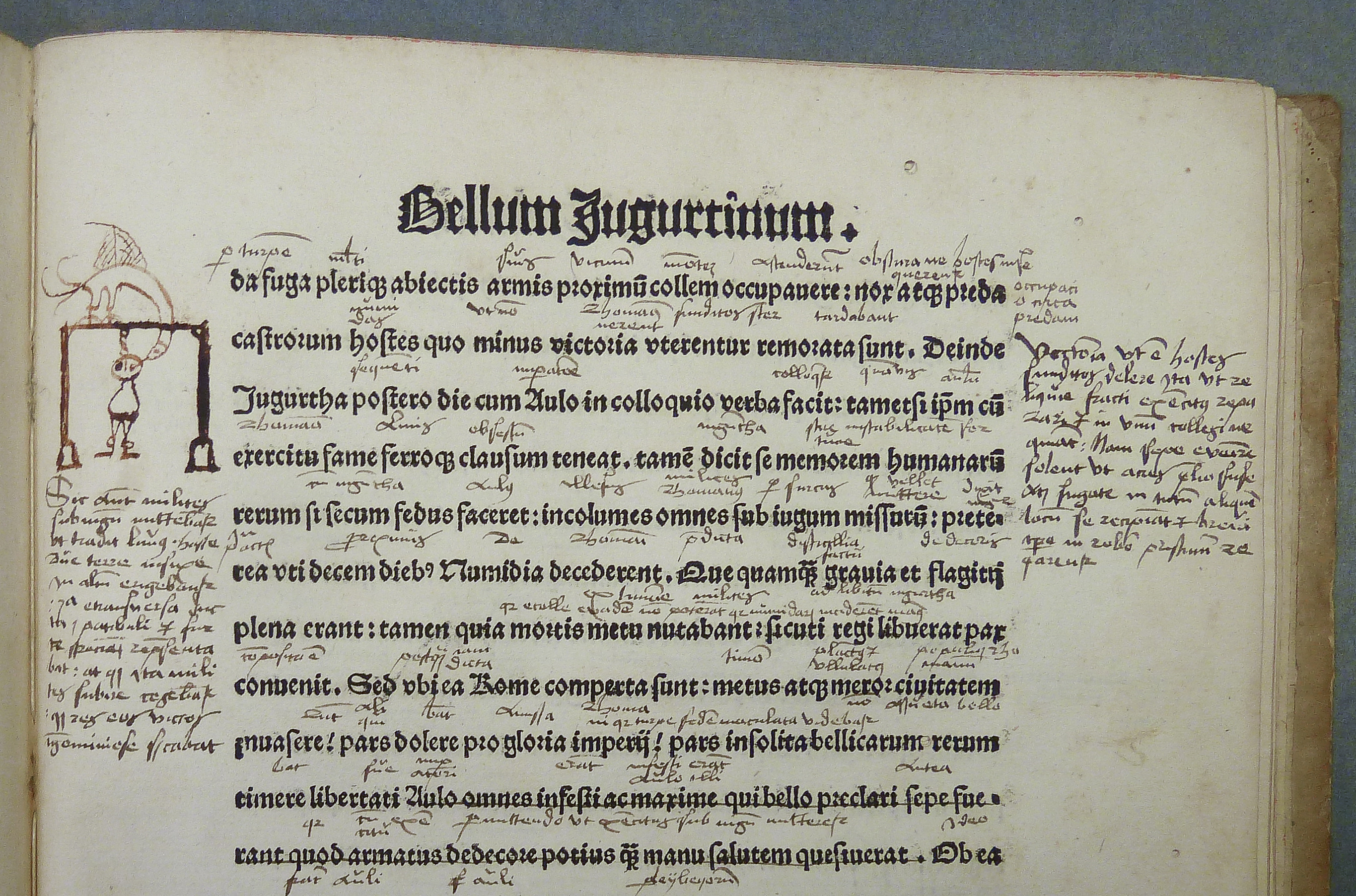 Portion of leaf C4r (annotated and with early ms. sketch of a bird pecking at the eye of a man hanged on a gallows in left margin) from one of two editions of Sallust's Bellum Jugurthinum (Leipzig: Martin Landsberg, after 1500 CE) Penn Libraries call number: Inc S-88.