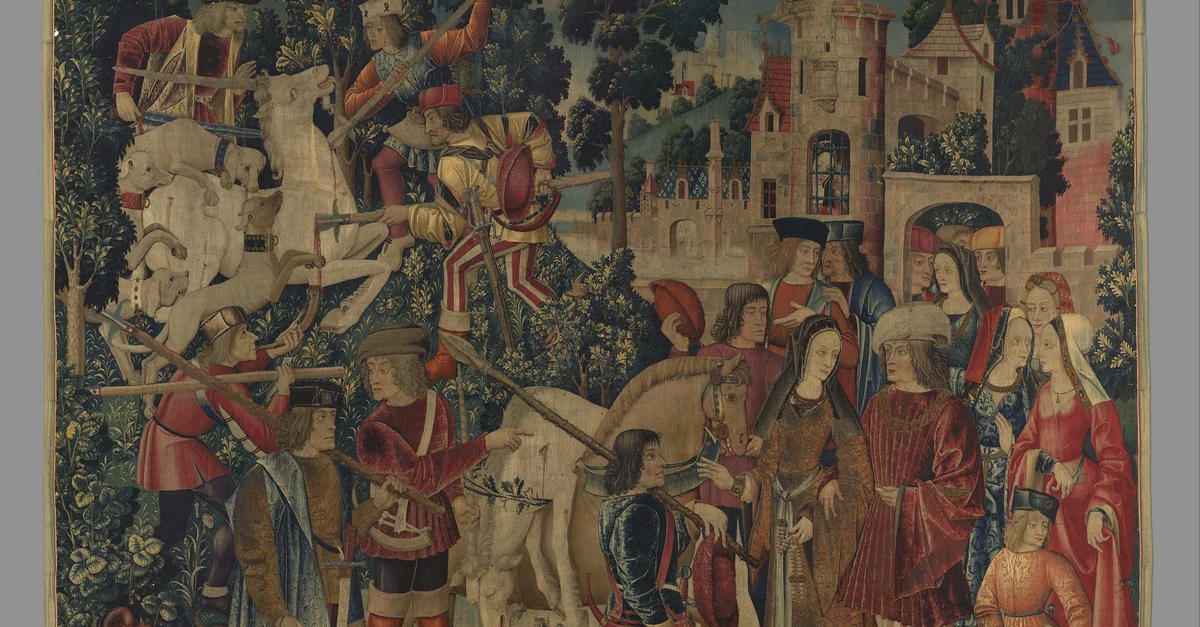 "The Hunters Return to the Castle" is one of seven tapestries in the "Unicorn Tapestries" group. These allegorical tapestries depict the hunting of a unicorn, a mythological animal common to European folklore. "The Hunters Return to the Castle" is a scene in two parts: it shows the death of the unicorn in the upper left corner, and the unicorn’s body, draped over the back of a horse, being presented to the lord and lady of the castle in the foreground. By the Middle Ages, the unicorn had acquired religious connotations, and was occasionally used as an allegorical symbol for Christ. The holly tree and thorny oak branches depicted in this tapestry are perhaps hinting at the Passion of Christ and the Crown of Thorns. The tapestries originally belonged the Le Rochefoucald family of France, and the earliest record of them confirms that they were hanging in the Paris home of François VI de La Rochefoucauld (1613 - 1680 CE) by 1680 CE. The tapestries are thought to have been woven in Brussels between 1495 – 1505 CE, although they were designed in Paris, France. The Unicorn Tapestries are now held by the Metropolitan Museum of Art in New York, and are housed in the Met Cloisters.