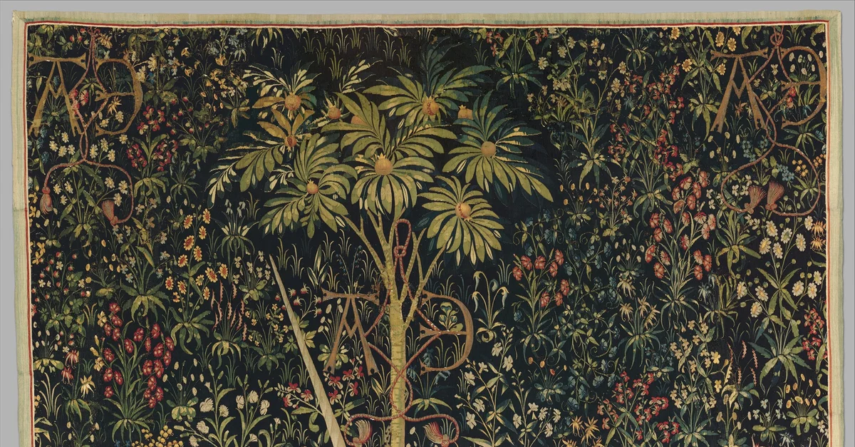 "The Unicorn Rests in a Garden" is one of seven tapestries in the "Unicorn Tapestries" group. These allegorical tapestries depict the hunting of a unicorn, a mythological animal common to European folklore. "The Unicorn Rests in a Garden" is commonly referred to as “The Unicorn in Captivity,” and is perhaps the most famous of the tapestries, though there is some debate about whether or not it was originally part of this series. Here, we see the unicorn in a small enclosure from which he could easily escape, tethered with a loose chain to a pomegranate tree and circled by a short fence. The unicorn is surrounded by symbols that a medieval audience would have recognized as indicators of fertility and marriage, including pomegranates, wild orchids, and thistles. While at first glance the unicorn may appear to be injured, the “blood” is more likely pomegranate juice from the fruit overhead. The tapestries originally belonged the Le Rochefoucald family of France, and the earliest record of them confirms that they were hanging in the Paris home of François VI de La Rochefoucauld (1613 - 1680 CE) by 1680 CE. The tapestries are thought to have been woven in Brussels between 1495 – 1505 CE, although they were designed in Paris, France. The Unicorn Tapestries are now held by the Metropolitan Museum of Art in New York, and are housed in the Met Cloisters.