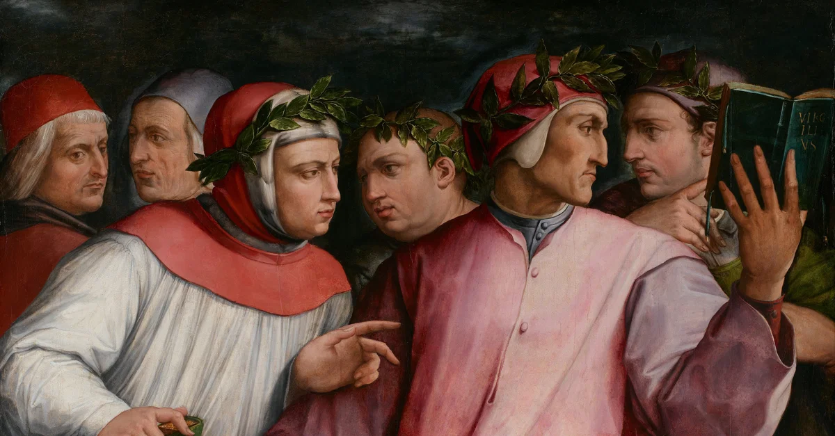 The 1544 painting by Giorgio Vasari (1511-1574) known as the 'Portrait of Six Tuscan Poets'. The poets are (left to right): Cino da Pistoia, Giuttone d'Arezzo, Petrarch, Giovanni Boccaccio, Dante Alighieri and Guido Cavalcanti. (Minneapolis Institute of Art, Minnesota, USA)