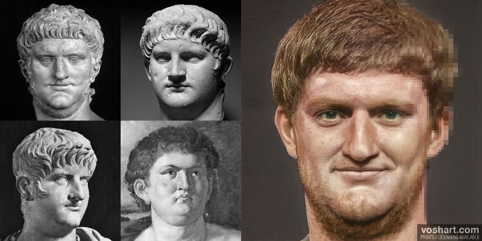 A photorealistic representation of what the Roman emperor Nero (r. 54-68 CE) may have looked like. Pictured alongside the reconstruction are the artworks and statuary used as references. From left to right and top to bottom these are the Capitoline Nero; the Glyptotek bust; the Uffizi Gallery's bust; and the painting by Peter Paul Rubens (1577–1640 CE). Based on contemporary and near contemporary descriptions, as well as archaeological and artistic evidence. Made using Photoshop and Artbreeder, a neural net tool.