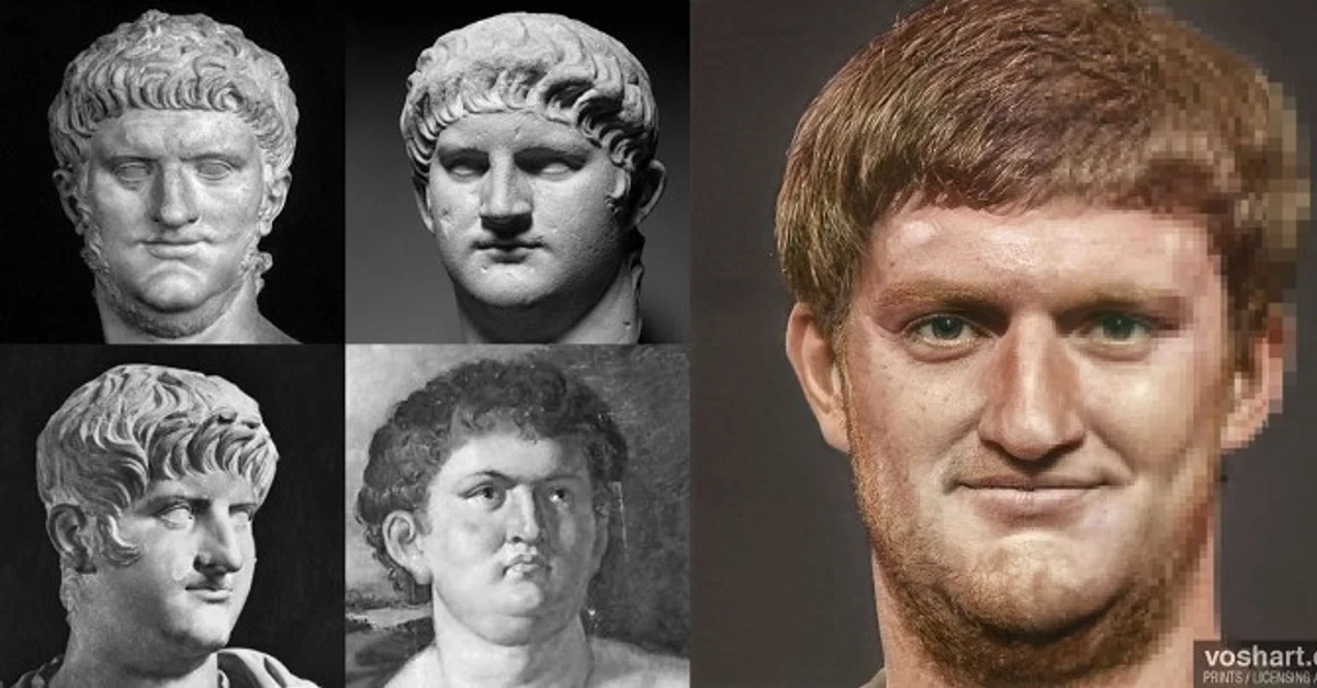 A photorealistic representation of what the Roman emperor Nero (r. 54-68 CE) may have looked like. Pictured alongside the reconstruction are the artworks and statuary used as references. From left to right and top to bottom these are the Capitoline Nero; the Glyptotek bust; the Uffizi Gallery's bust; and the painting by Peter Paul Rubens (1577–1640 CE). Based on contemporary and near contemporary descriptions, as well as archaeological and artistic evidence. Made using Photoshop and Artbreeder, a neural net tool.