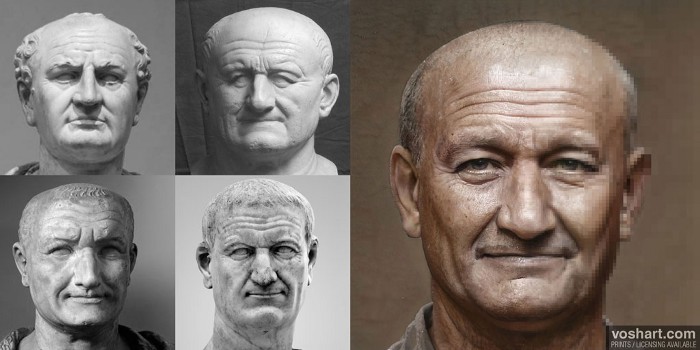 A photorealistic representation of what the Roman emperor Vespasian (r. 69-79 CE) may have looked like. Pictured alongside the reconstruction are the artworks and statuary used as references. From left to right and top to bottom, these are the Louvre bust; Glyptotek bust; Capitoline bust; and the bust from the National Archaeological Museum, Naples. Based on contemporary and near contemporary descriptions, as well as archaeological evidence. Made using Photoshop and Artbreeder, a neural net tool.