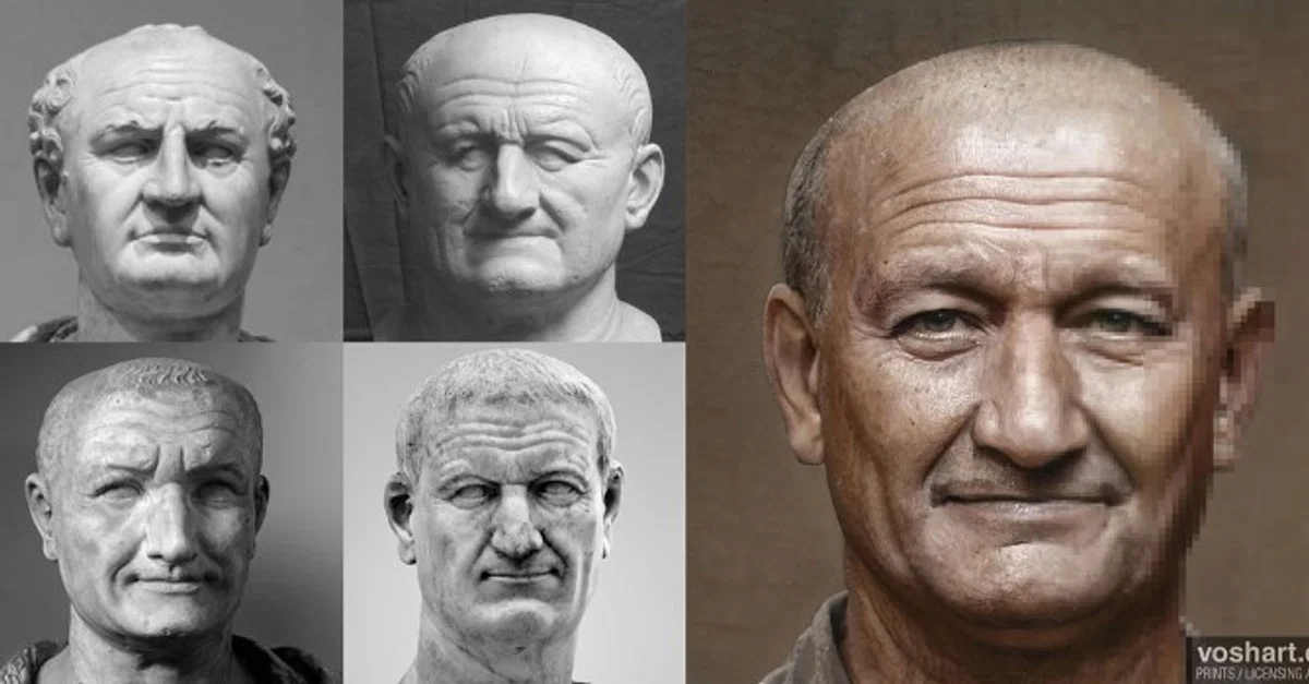 A photorealistic representation of what the Roman emperor Vespasian (r. 69-79 CE) may have looked like. Pictured alongside the reconstruction are the artworks and statuary used as references. From left to right and top to bottom, these are the Louvre bust; Glyptotek bust; Capitoline bust; and the bust from the National Archaeological Museum, Naples. Based on contemporary and near contemporary descriptions, as well as archaeological evidence. Made using Photoshop and Artbreeder, a neural net tool.
